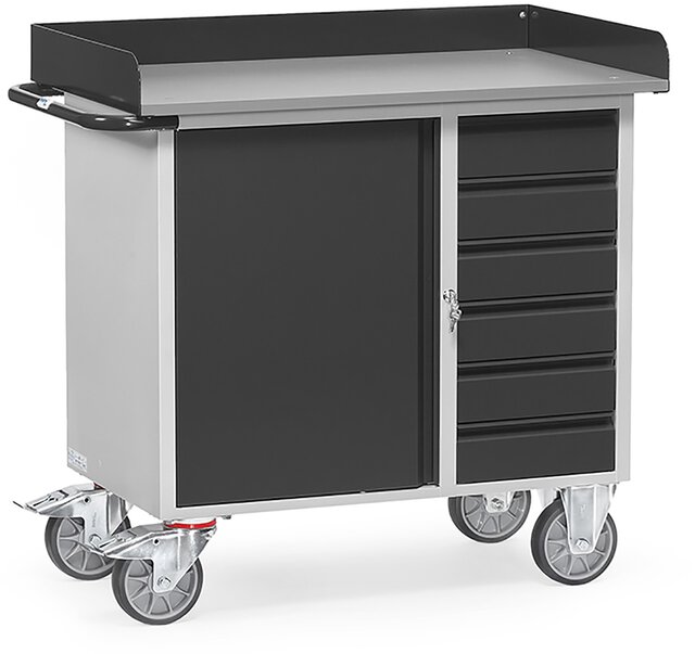 Stahlblech-Werkstattwagen "GREY EDITION", Tragkraft 400kg, 1 Schrank und 6 Schubladen, Arbeitsplatte mit Abrollrand, 985x590mm
