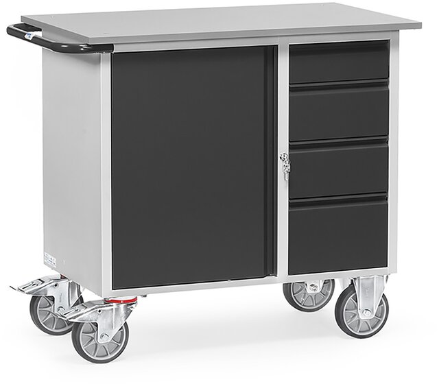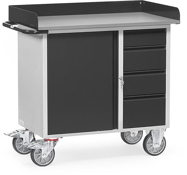 Stahlblech-Werkstattwagen "GREY EDITION", Tragkraft 400kg, 1 Schrank und 4 Schubladen, Arbeitsplatte mit Abrollrand, 985x590mm