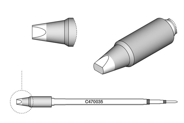- Meißelförmig: Mit der meißelförmigen Lötspitze wie dem Modell C470-014 lassen sich größere Lötflächen schnell und effizient bearbeiten. Sie bietet eine hervorragende Wärmeübertragung und ist somit ideal für großflächige Lötstellen.