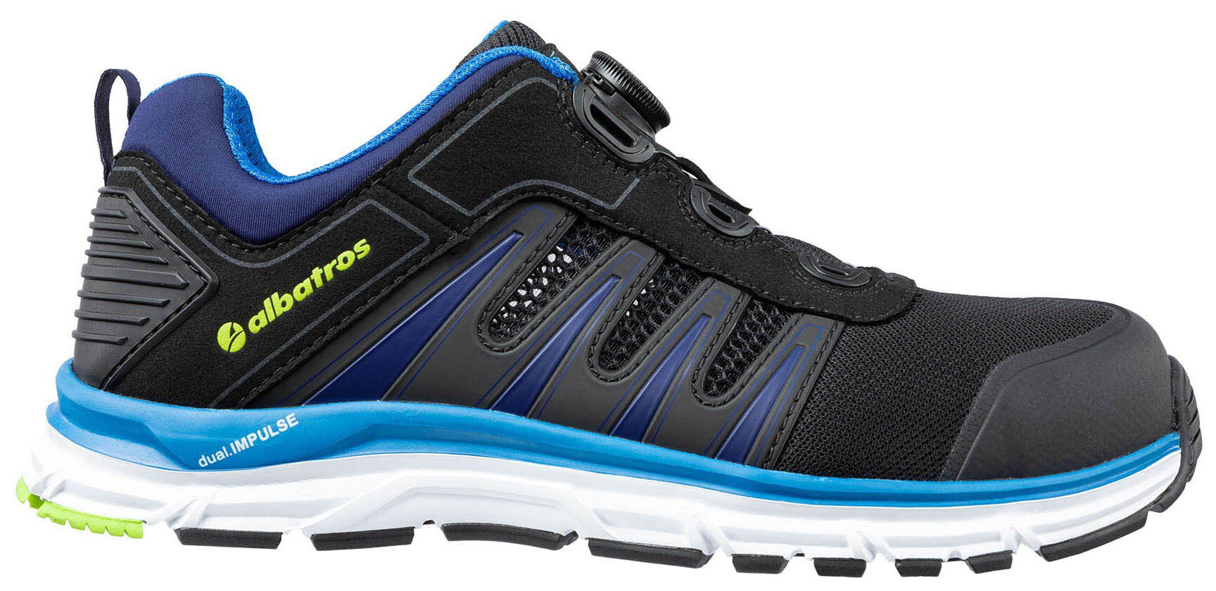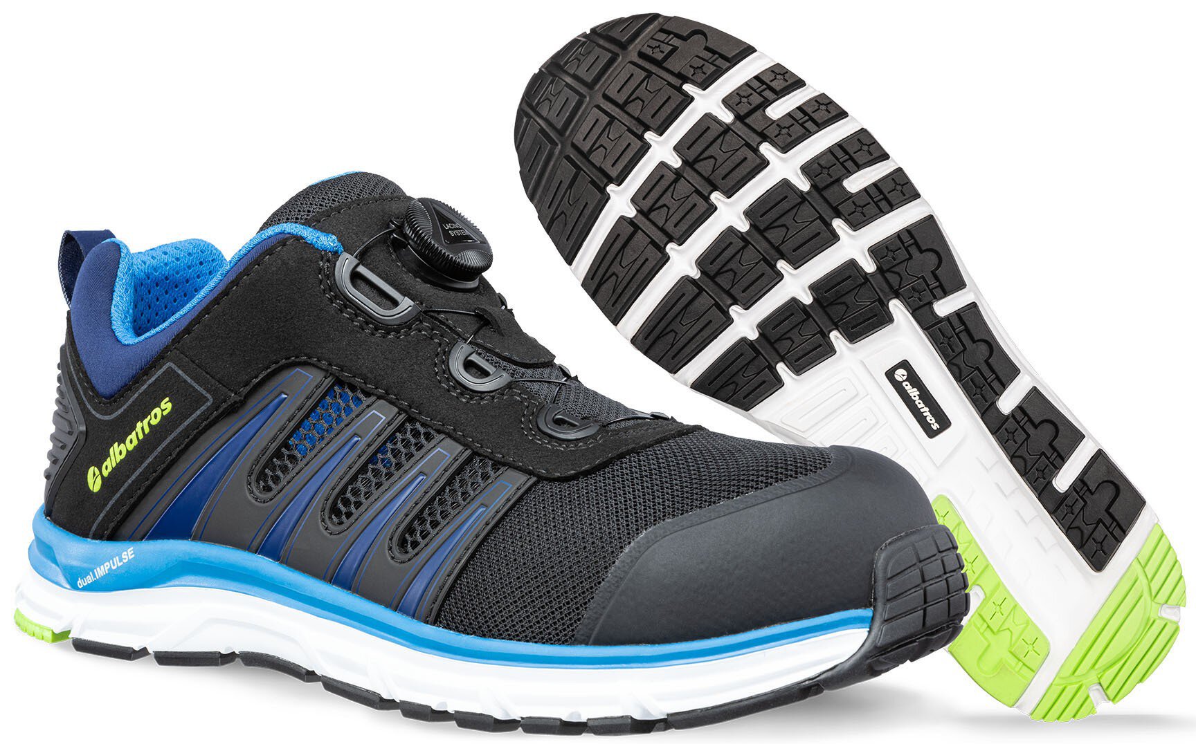Die Revolution im Sicherheitsschuhbereich! Inspiriert durch innovative Laufschuhe bringt ALBATROS® mit dual.IMPULSE die erste Sicherheitsschuhlinie mit einer direkt angespritzten Mittelsohle auf den Markt, die aus zwei Lagen unterschiedlicher Dichte IMPULSE.FOAM besteht. IMPULSE.FOAM ist die Anti-Fatigue-Technologie in deinem Sicherheitsschuh. Dieses intelligente Sohlenkonzept bietet alles: maximale Dämpfung mit Energierückgabe sowie hervorragende Stabilität und langanhaltenden Komfort. Der kaum von einem Sportschuh zu unterscheidende, metallfreie LIFT RED IMPULSE LOW hat einen Schaft aus strapazierfähigem 3D-Textilgewebe. Er ist mit einer Fiberglaskappe und metallfreiem, flexiblen FAP® Durchtrittschutz ausgestattet, erfüllt die ESD-Anforderungen und verfügt über ein atmungsaktives Funktionsfutter. Ein weiteres Plus an Komfort stellt die neuentwickelte, anatomisch geformte, feuchtigkeitsregulierende ALBATROS® comfit® AIR Einlegesohle mit rutschfester Textiloberfläche dar. Die comfit® AIR verfügt über Erhöhungen im Fersen- und Ballenbereich sowie eine Längsgewölbeunterstützung, die die natürliche Haltung des Fußes im Schuh unterstützen. So wird der Fuß entlastet und die Muskulatur beim Gehen stimuliert.