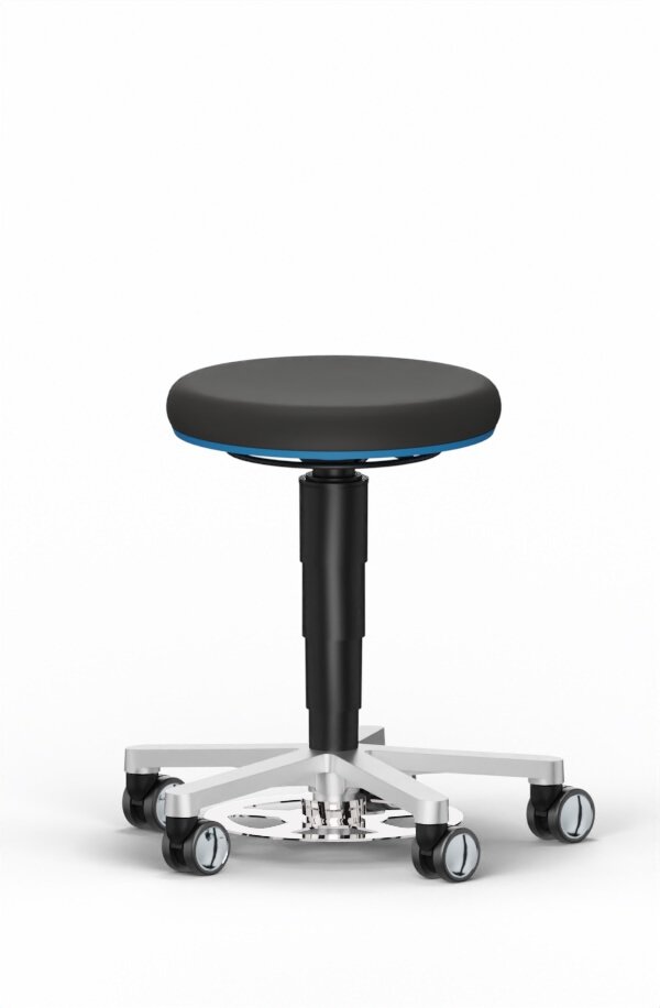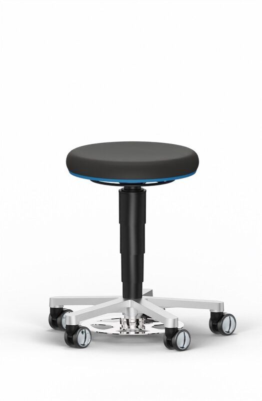 Labor Hocker, mit Fußauslösung und Rollen, Kunstleder Magic schwarz, Farbring blau
