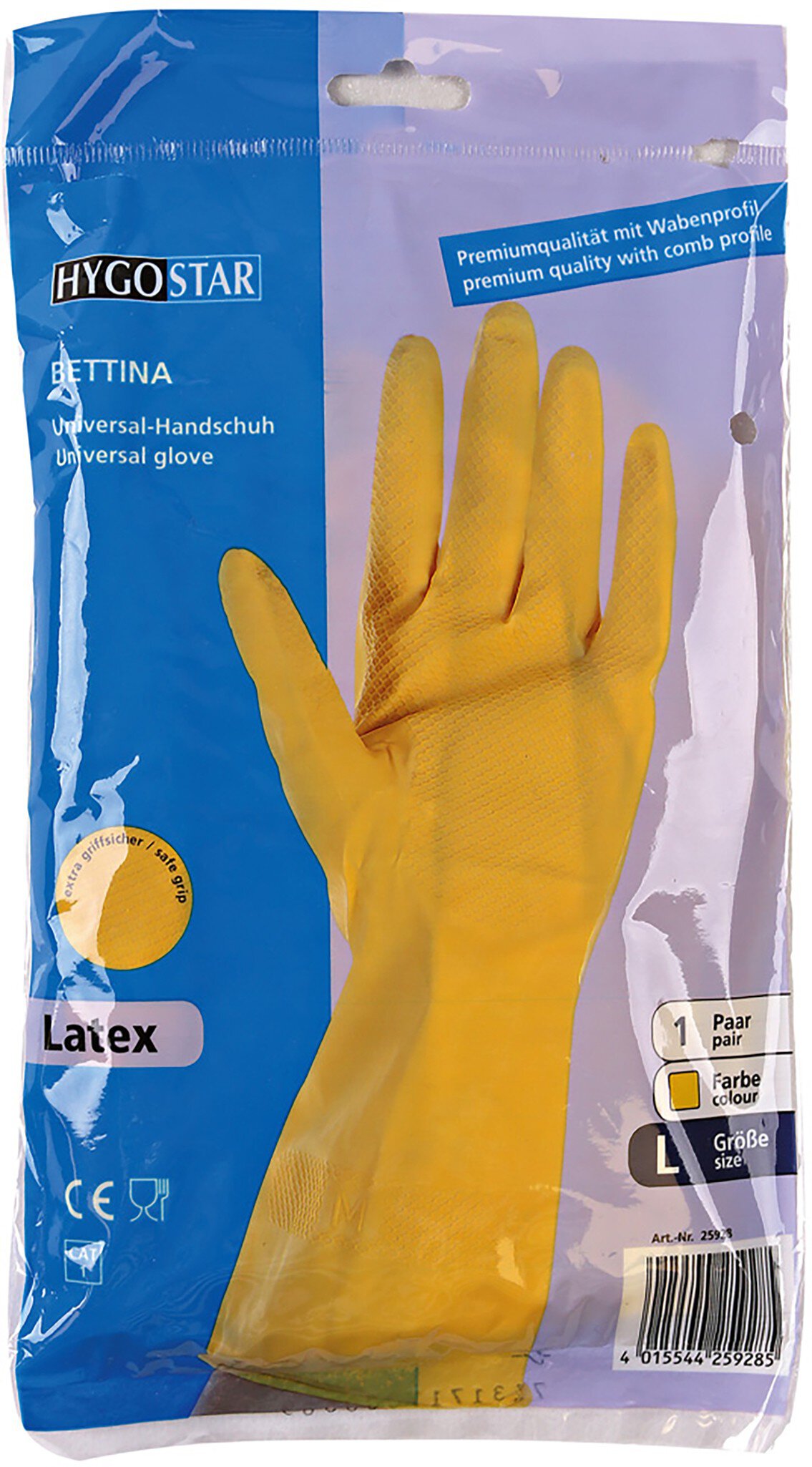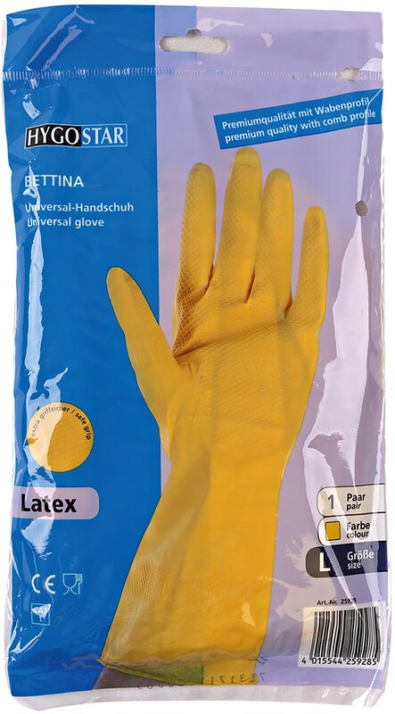 Haushaltshandschuh Bettina von Hygostar: Der Haushaltshandschuh BETTINA ist universell einsetzbar. Als hochwertiger Reinigungshandschuh schützt er Ihre Hände zuverlässig vor Feuchtigkeit, Reinigungsmitteln und Laugen. Er ist geeignet für den Umgang mit Lebensmitteln und durch die beflockte Innenseite sehr angenehm zu tragen. Der hohe Latexanteil sorgt für eine herausragende Elastizität und extreme Reißfestigkeit. Der Handschuh eignet sich für viele verschiedene Anwendungsbereiche wie die Industrie, Kantine, Labor oder Reinigung.