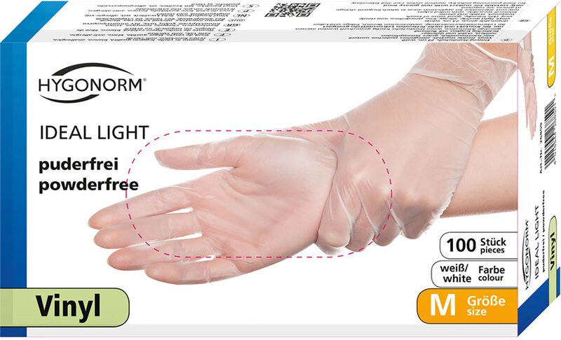 Vinylhandschuh Ideal Light von Hygonorm: Der Handschuh IDEAL LIGHT besteht aus transparentem, leichtem Vinyl mit einem Rollrand, der bei erhobenen Händen Tropfen auffängt. Der Handschuh ist reißfest und sehr dehnbar. Er kann an beiden Händen getragen werden, hat ein gutes Tastempfinden und ist sehr hautfreundlich. Der Handschuh IDEAL LIGHT ist nur für den Einsatz mit nicht fettenden Lebensmitteln geeignet. Sonst stellt er eine kostengünstige Alternative für Anwendungsbereiche dar, in denen ein häufiger Handschuhwechsel erforderlich ist. Er ist bestens geeignet für die Lebensmittelindustrie, Qualitätskontrolle, Lagerarbeiten, Verpackung, Sanitärbereich, Elektroindustrie, Medizin und Pflege.