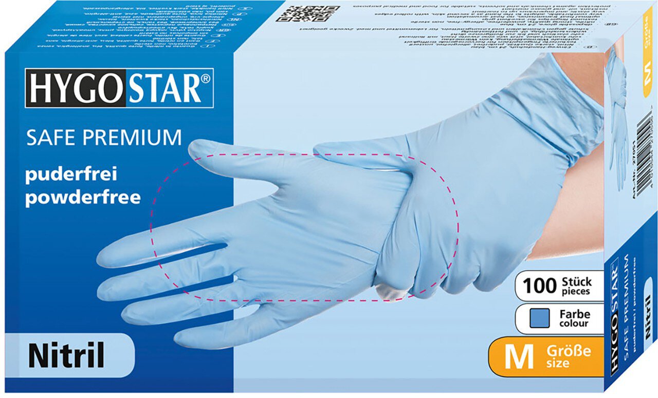 Nitrilhandschuhe Safe Premium von Hygostar: Der Nitrilhandschuh Safe Premium von Hygostar ist ein Handschuh in Premium-Qualität. Er bietet Schutz gegen Chemikalien und Lösungsmittel und ist für den Lebensmittelbereich sowie auch medizinische Zwecke sehr gut geeignet. Durch seine angeraute Oberfläche sorgt er zudem für eine hervorragende Griffigkeit. Er passt sich perfekt an ihre Hand an und sorgt durch eine optimale Wärmeableitung für ein angenehmes Tragegefühl, auch bei längerer Tragedauer. Durch das Material ist der Safe Premium besonders hautfreundlich und verfügt über einen hervorragenden Nassgriff.