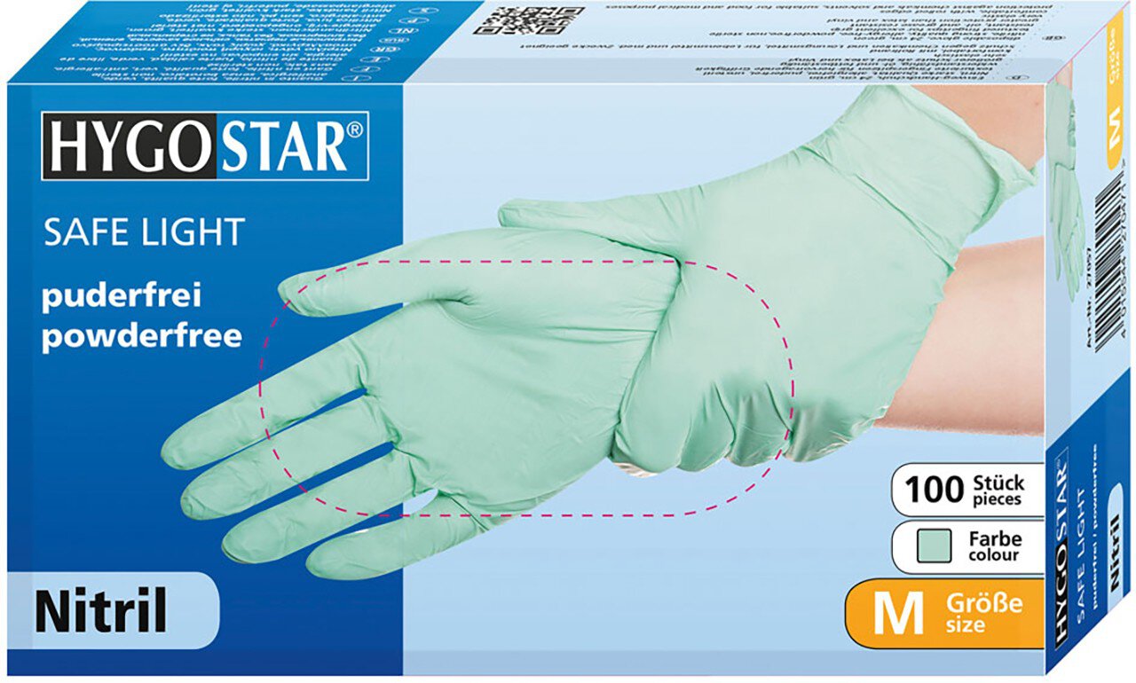 Nitrilhandschuhe Safe Light von Hygostar: Diese Nitrilhandschuhe sind universell einsetzbar, egal ob in Medizin, Lebensmittelindustrie, Gastronomie oder Industrie. Als puderfreier Nitrilhandschuh ist der Safe Light besonders hautfreundlich, latexfrei und daher für Allergiker geeignet. Ideal für alle, die lange und häufig mit Einweghandschuhen arbeiten. Optimale Passform und ein angenehmes Tragegefühl sind Ihnen sicher. Der Einweghandschuh kann sowohl als Schutzhandschuh gegen Chemikalien in Industrie und Labor getragen werden als auch als Hygienehandschuh für die Zubereitung von Speisen. Der Nitrilhandschuh SAFE LIGHT ist lebensmittelecht und ohne Einschränkung für den Umgang mit Nahrungsmitteln zertifiziert. Auch die Arbeit mit öligen oder fettigen Lebensmitteln wie Fleisch, Fisch oder Käse ist möglich. Darüber hinaus kann er als medizinischer Einweghandschuh getragen werden. Er schützt zuverlässig vor Infektionen und ist für den Umgang mit Zytostatika zugelassen. Als echtes Multitalent können Sie den SAFE LIGHT auch in der Industrie als Schutzhandschuh einsetzen, da er zertifiziert ist nach der Kategorie CAT 3 der PSA-Richtlinie.