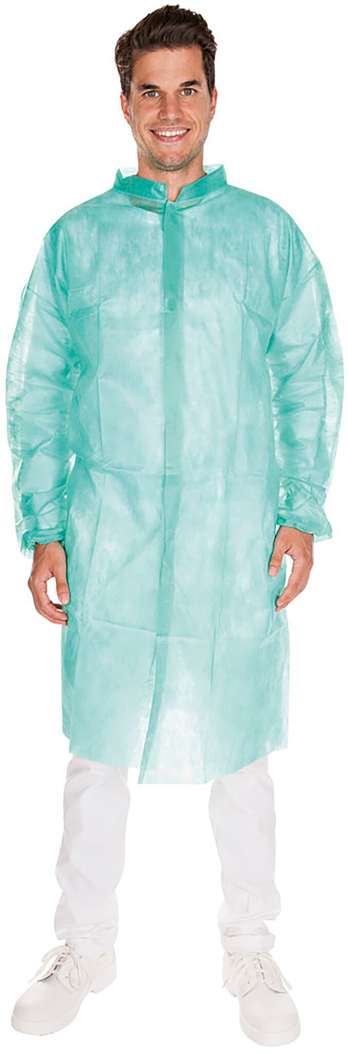 PP-Vlies, ca. 25 g/m2 mit Klettverschluss und Stehkragen luftdurchlässig und strapazierfähig extra groß hoher Tragekomfort mit elastischem Gummiband an den Handgelenken für einen guten Sitz