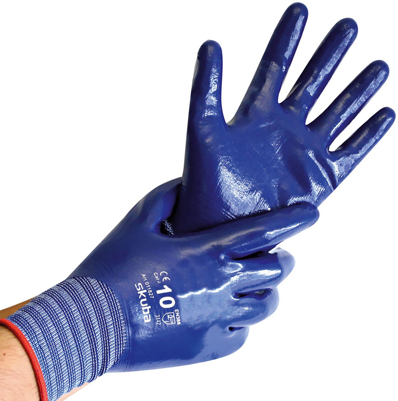 Arbeitshandschuhe SKUBA von Hygostar: Der Industriehandschuh SKUBA ist dank seiner robusten Nitrilbeschichtung dicht gegen Öle und andere Flüssigkeiten. Der Handschuh ist mit einer Vollbeschichtung ausgestattet, so dass auch der Handrücken vor Flüssigkeiten wie Ölspritzer geschützt ist. Das Trägermaterial besteht aus Nylon-Feinstrick. Nylon ist besonders hautfreundlich und angenehm zu tragen. Die hochwertigen Materialien machen den Arbeitshandschuh SKUBA zu einem exzellenten Schutzhandschuh für Reparaturarbeiten an Autos oder Maschinen. Darüber hinaus überzeugt der Arbeitshandschuh durch seine hohe mechanische Belastbarkeit.