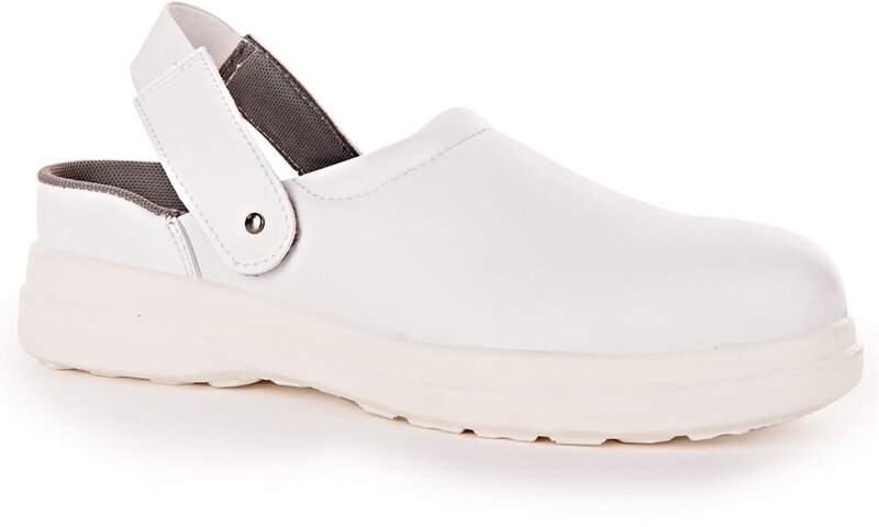 Sicherheitsschuh Clog - in Weiß und Schwarz erhältlich: Der Sicherheitsschuh Clog SB A-E besteht aus Kunstleder und einer Sohle aus Polyurethan. Diese Sohle ist beständig gegen Öl und Brennstoffe und sorgt zudem für eine excellente Rutschfestigkeit. Neben diesen Eigenschaften ist die Sohle auch noch antistatisch und stoßabsorbierend im Fersenbereich. Der Schuh ist mit einer Stahlkappe, die bis 200 Joule geprüft ist, und einem antibakteriellen Innenfutter ausgestattet. Der Riemen ist abnehmbar. Der Schuh kann dampfdrucksterilisiert werden und ist bis 40°C waschbar. Da der Schuh sehr leicht ist, eignet er sich sehr gut für den langen Gebrauch in der Chemieindustrie oder Großküchen und Kantinen.