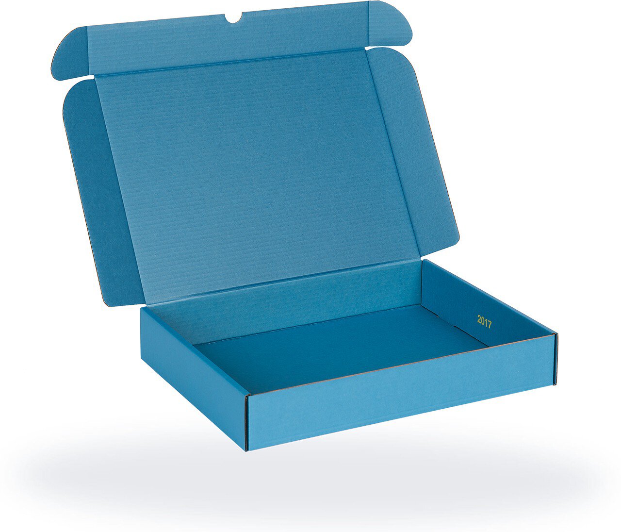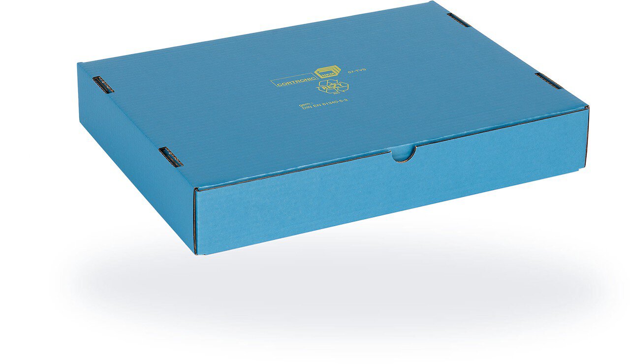 CORTRONIC® Versandschachtel von Hans Kolb flachliegend mit Warndruck für die ESD-Schutzzone.