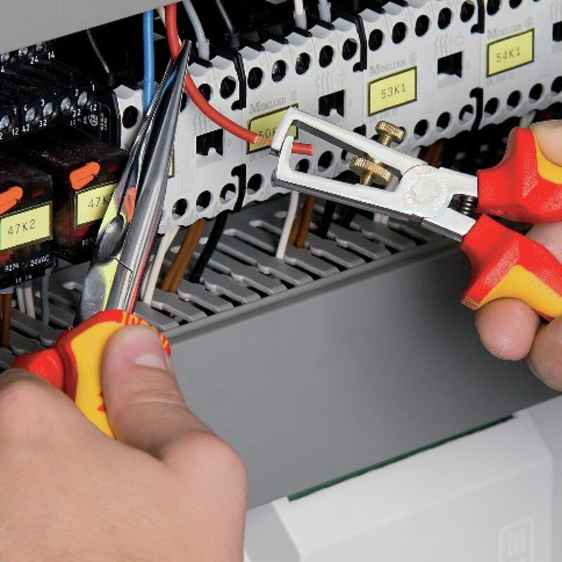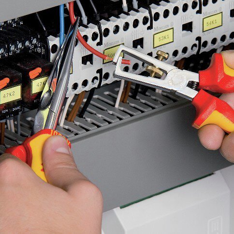 Die Abisolierzange mit Öffnungsfeder, verchromt, isoliert, 160 mm von KNIPEX überzeugt durch präzise Verarbeitung und hohe Funktionalität. Entwickelt für professionelle Anwendungen, ermöglicht dieses Werkzeug ein müheloses und sauberes Abisolieren verschiedenster Leiter und Litzen. Für ein-, mehr- und feindrähtige Leiter mit Kunststoff- oder Gummiisolation max. Ø 5 mm oder 10 mm² Leiterquerschnitt Einfache Verstellung auf den gewünschten Draht- oder Litzendurchmesser durch Rändelschraube und Kontermutter Die robuste Bauweise und ergonomische Form sorgen für eine komfortable Handhabung und lange Lebensdauer. Ein unverzichtbares Werkzeug für Elektriker, Techniker und alle, die präzise und effiziente Arbeiten im Bereich der Kabelbearbeitung durchführen möchten.