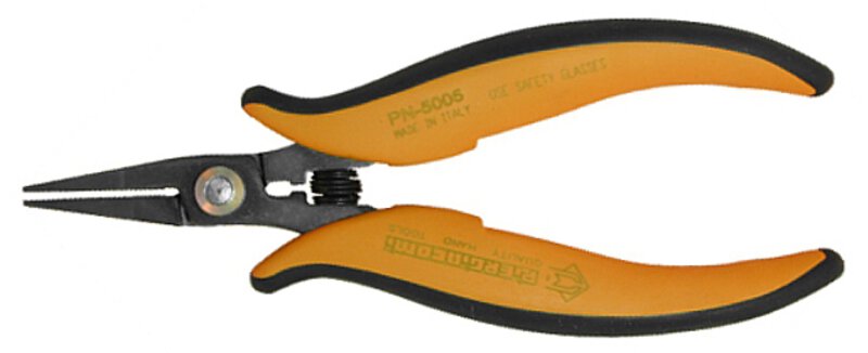 • Gezackte, spitze, lange Zange. Für die allgemeine Handhabung aller Arten von Bauteilen