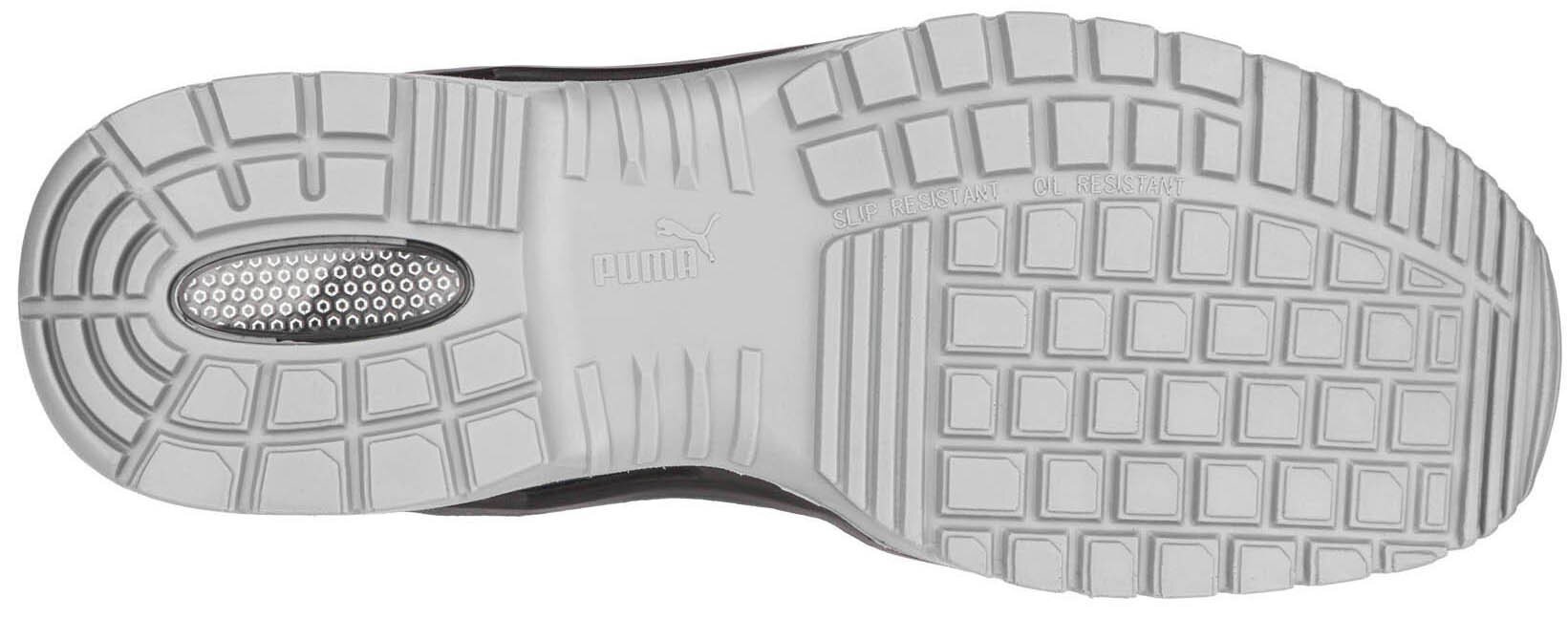 AHEAD OF TIME Der metallfreie FUSE TC aus der TECHNICS LINE Linie von PUMA SAFETY zeichnet sich durch hohe Flexibilität und spürbar leichte Bauweise aus. Erreicht wird das durch die naturalFLEXMOTION-Sohlenarchitektur. Sie kombiniert das "Natural Running"-Konzept mit modernster Sicherheitsschuhtechnologie. Der Schaft des S1P Sicherheitsschuhs mit ESD Eigenschaften ist mit Hilfe der FUSE.TEC Technologie hergestellt worden. Dabei werden Verstärkungselemente nahtlos auf das textile Basismaterial aufgeschweißt. Dadurch kommt man in stark beanspruchten Bereichen wie Flexzonen ganz ohne Nähte aus. Der Schuh wird flexibler, widerstandsfähiger und hat eine perfekte Passform. Das eingelegte evercushion BA Fußbett aus offenporigem Schaumstoff transportiert Feuchtigkeit vom Fuß weg und sorgt zusammen mit dem atmungsaktiven BreathActive Funktionsfutter für ein angenehmes Fußklima den ganzen Tag lang. Das speziell entwickelte Wafer-Profil der Laufsohle garantiert dabei bestmöglichen Grip, vor allem auf glatten Industrieböden.