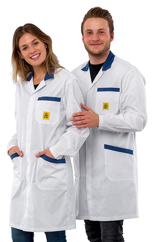 Die Unisex Ausführung mit blauen Applikationen an Kragen und Taschen des ESD-Kittels garantiert eine passgenaue Passform für Damen und Herren gleichermaßen. Praktische Details wie die 2 Seitentaschen, die Druckknöpfe an den Ärmeln und die Knopfreihe mit Stoffabdeckung zeugen von durchdachtem Design. Der Reverskragen und die verdeckte Knopfleiste verleihen dem ESD-Kittel zudem eine professionelle Optik.