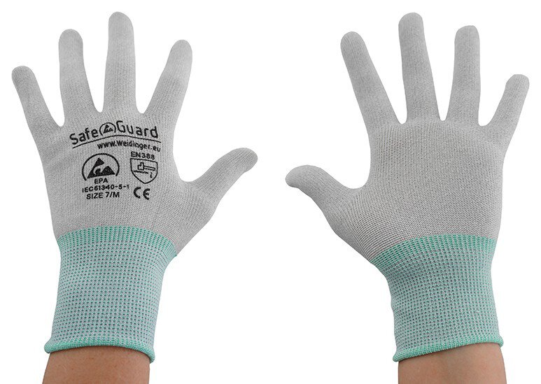 Tauchen Sie ein in ultimativen Schutz und Komfort mit den SafeGuard ESD-Handschuhen. Das grau-türkise Design ohne Beschichtung vereint Stil und Funktionalität auf höchstem Niveau. Hergestellt aus hochwertigem Nylon und Carbon bieten sie ein angenehmes und komfortables Tragegefühl, das seinesgleichen sucht. Die nahtlose Verarbeitung sorgt für eine perfekte Passform und maximale Bewegungsfreiheit. Dank ihrer atmungsaktiven Eigenschaften sind sie ideal für längere Tragezeiten geeignet. Die Handschuhe entsprechen den strengen Anforderungen der DIN EN 61340-5-1 und sind nach EN 388 zertifiziert (Prüfnummer: 113x). Mit einem Ableitwiderstand von 10⁷ - 10⁸ Ohm halten diese Handschuhe elektrostatische Entladungen zuverlässig in Schach. Die Handschuhe sind zu 100% silikonfrei und werden inklusive Verpackung geliefert, die mit dem CE-Kennzeichnung, dem SafeGuard Logo und der ESD Kennzeichnung versehen ist. Sichern Sie sich jetzt die SafeGuard ESD-Handschuhe und profitieren Sie von erstklassigem Schutz und höchstem Tragekomfort. Zeigen Sie Ihre Professionalität und Expertise mit jedem Handgriff - mit SafeGuard.