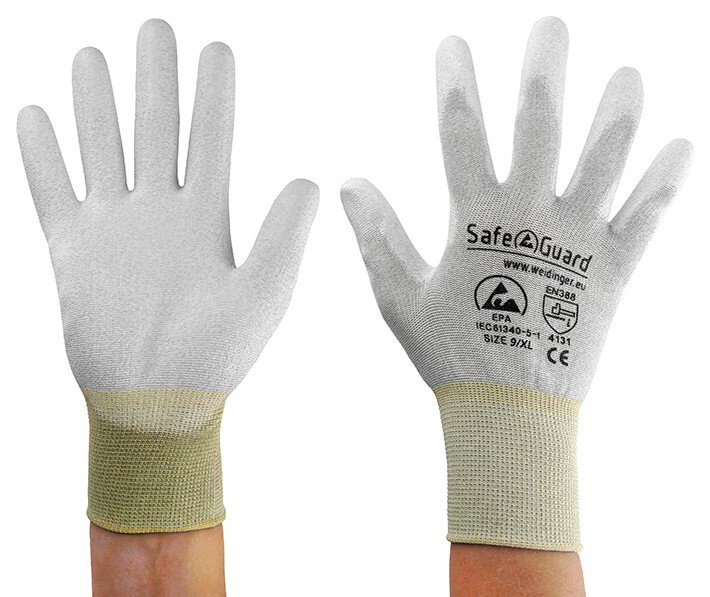 Tauchen Sie ein in ultimativen Schutz und Komfort mit den SafeGuard ESD-Handschuhen. Das grau-gelbe Design mit beschichteten Handflächen vereint Stil und Funktionalität auf höchstem Niveau. Hergestellt aus hochwertigem Nylon und Carbon bieten sie ein angenehmes und komfortables Tragegefühl, das seinesgleichen sucht. Die nahtlose Verarbeitung sorgt für eine perfekte Passform und maximale Bewegungsfreiheit. Dank ihrer atmungsaktiven Eigenschaften sind sie ideal für längere Tragezeiten geeignet. Die Handschuhe entsprechen den strengen Anforderungen der DIN EN 61340-5-1 und sind nach EN 388 zertifiziert (Prüfnummer: 113x). Mit einem Ableitwiderstand von 10⁷ - 10⁸ Ohm halten diese Handschuhe elektrostatische Entladungen zuverlässig in Schach. Die Handschuhe sind zu 100% silikonfrei und werden inklusive Verpackung geliefert, die mit dem CE-Kennzeichnung, dem SafeGuard Logo und der ESD Kennzeichnung versehen ist. Sichern Sie sich jetzt die SafeGuard ESD-Handschuhe und profitieren Sie von erstklassigem Schutz und höchstem Tragekomfort. Zeigen Sie Ihre Professionalität und Expertise mit jedem Handgriff - mit SafeGuard.