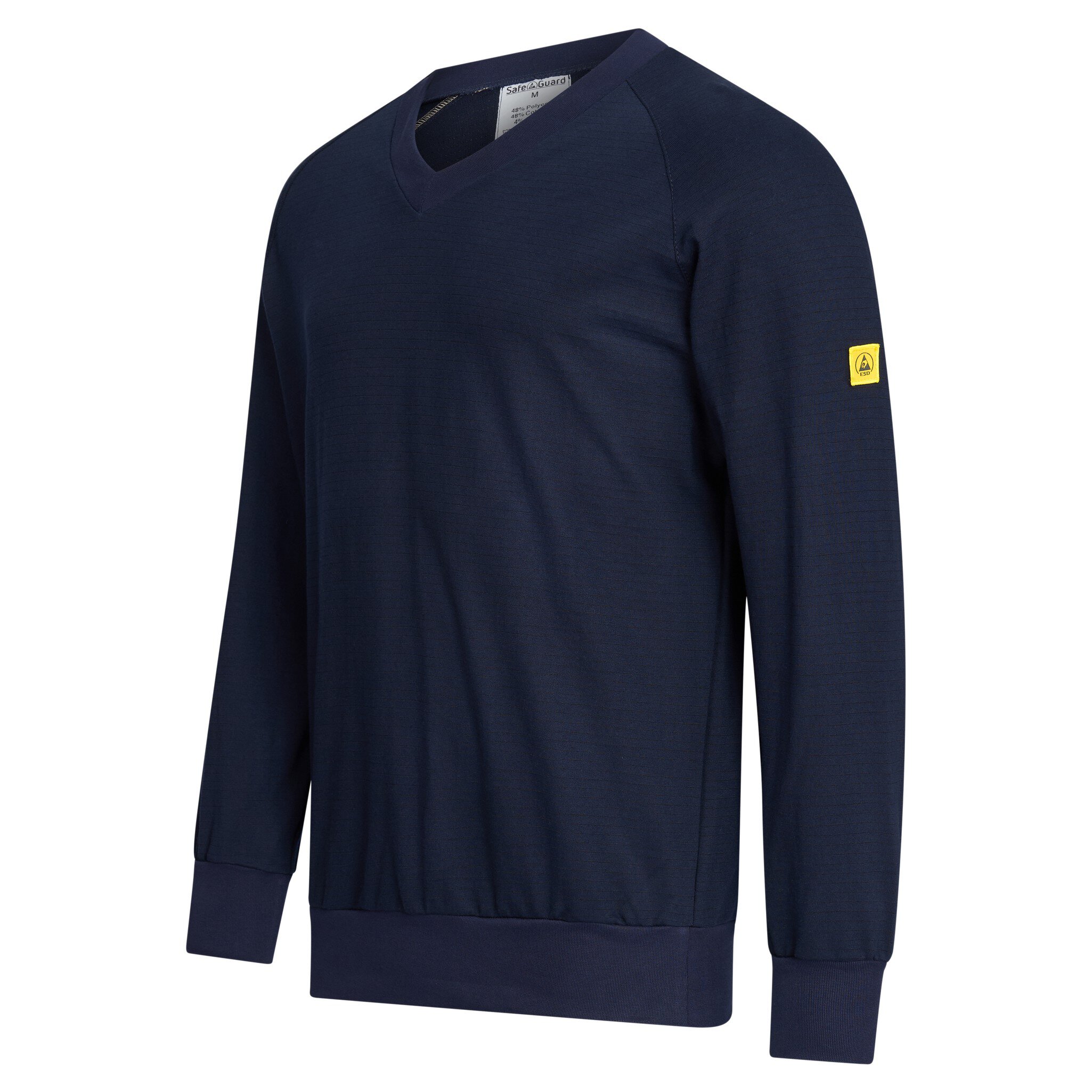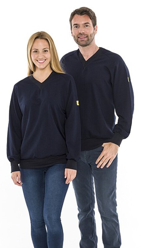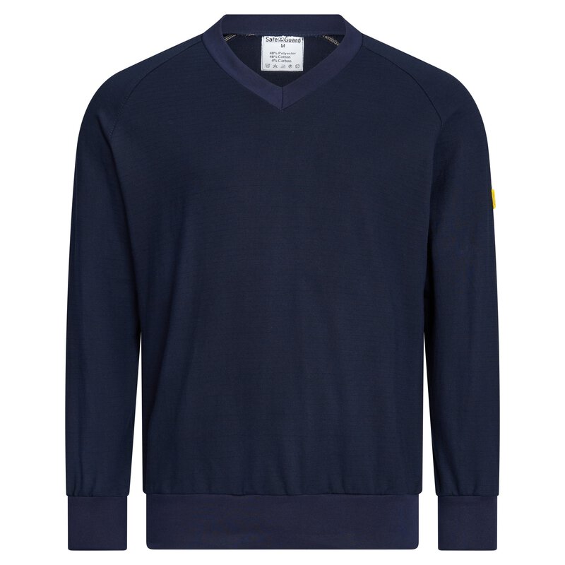 Unsere ESD Sweatshirts von SafeGuard sind die ideale Wahl für alle, die Komfort und Funktionalität schätzen. Mit dem ESD Logo auf dem linken Ärmel und den Strickbündchen an Ärmeln und Saum vereinen sie Stil und Passform in einem Kleidungsstück. Das langärmlige Sweatshirt in Blau ist unisex und verfügt über einen V-Ausschnitt. Es erfüllt die Anforderungen der DIN EN 61340-5-1 und bietet einen typischen Oberflächenwiderstand von 10⁵ bis 10⁷ Ohm. Hergestellt aus 48% Baumwolle, 48% Polyester und 4% Carbonfaser, hat das Sweatshirt ein Flächengewicht von 280 g/m². Holen Sie sich jetzt Ihr SafeGuard ESD Sweatshirt und erleben Sie Qualität und Funktionalität in einem Kleidungsstück!