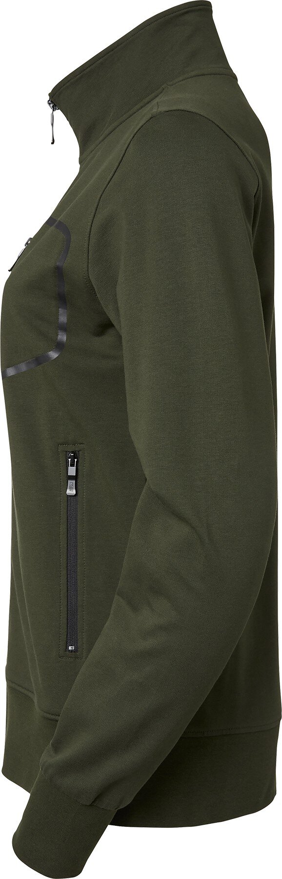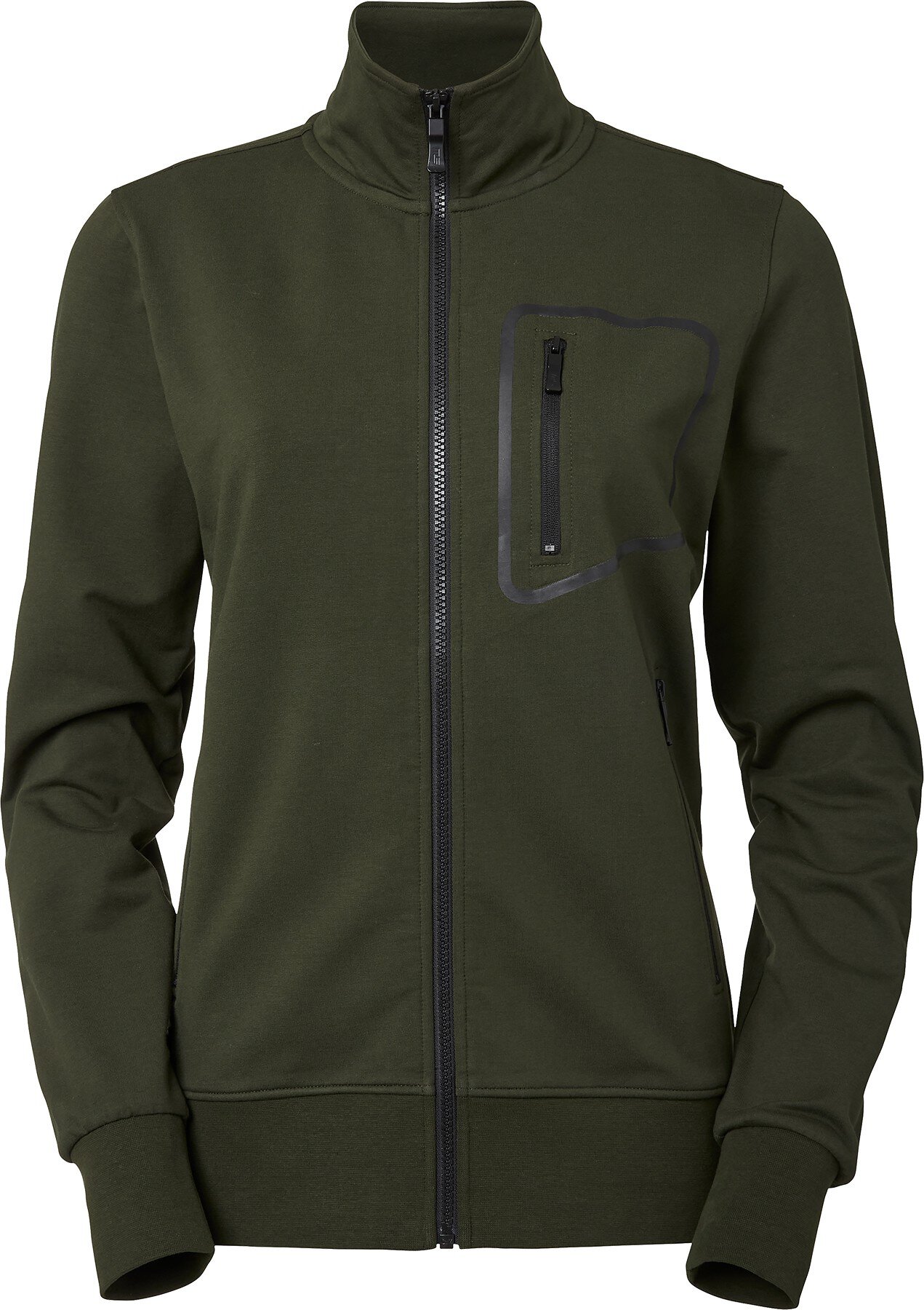 Sweatjacke mit hohem Halsausschnitt und durchgehendem Reißverschluss für Damen aus bequemem, dehnbarem Material. Seitentaschen und Brusttasche mit Reißverschluss. Reißverschlüsse mit geprägtem Logo.