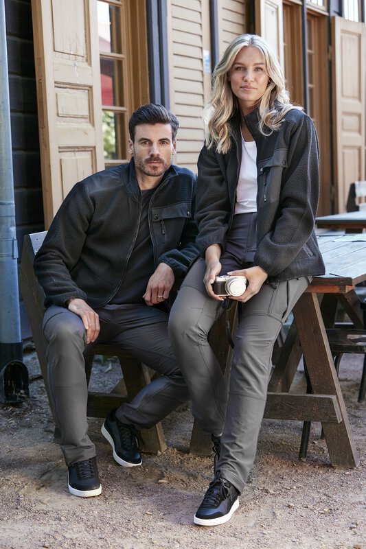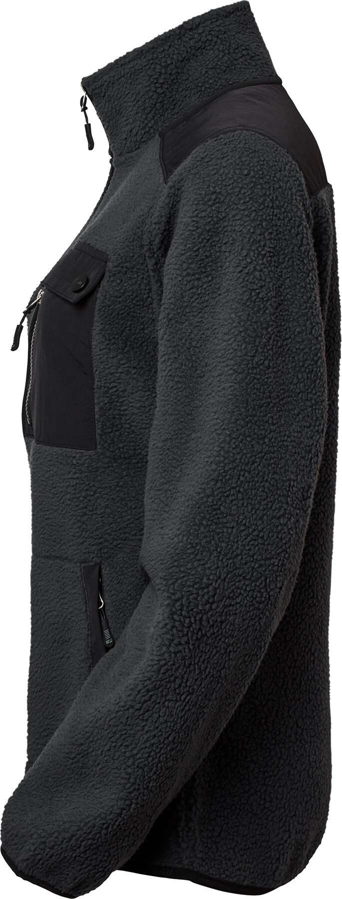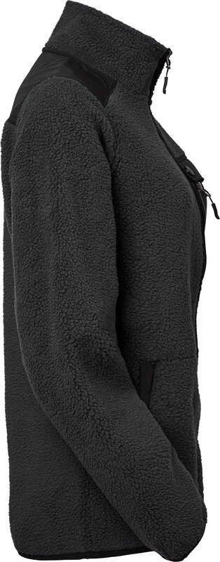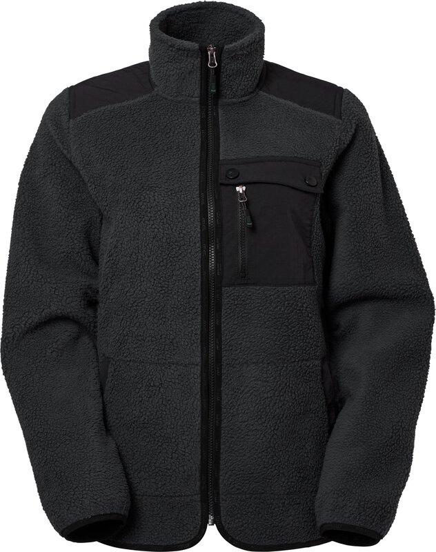 Sherpa-Fleece in Damenpassform, das innen weich und bequem und außen flauschig ist. Diese Jacke hat verstärkte Abschnitte an den Schultern und der Rückenpartie. Zwei Seitentaschen mit Reißverschlüssen und Leistentaschen. Brusttasche mit Doppelfunktion - eine mit Lasche, eine mit Reißverschluss. Alle gewebten Teile der Jacke sind schwarz. Geschwungener unterer Saum am Rücken mit dezentem SW-Gummilabel.