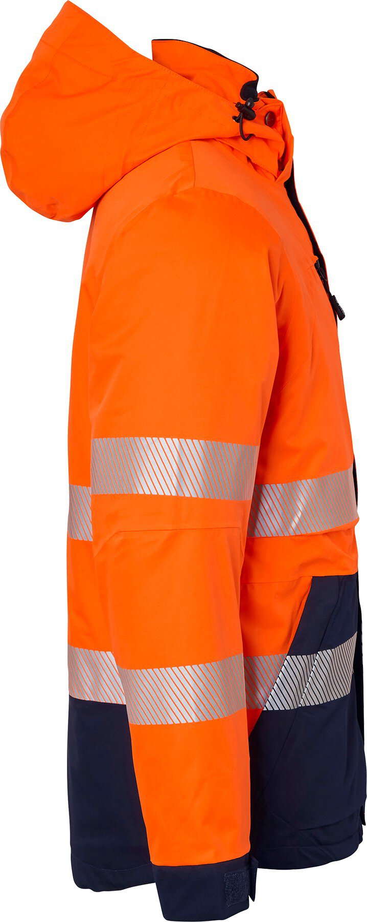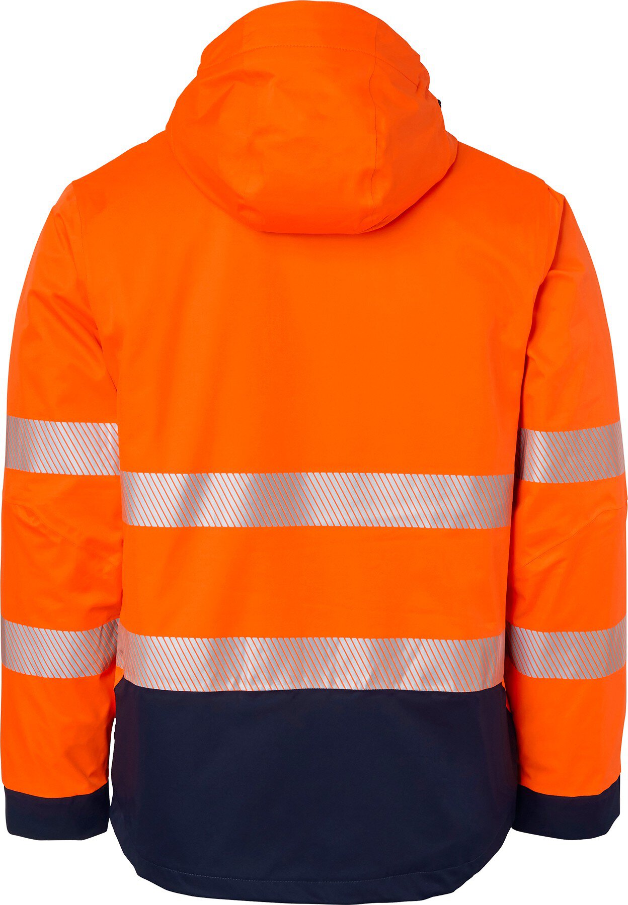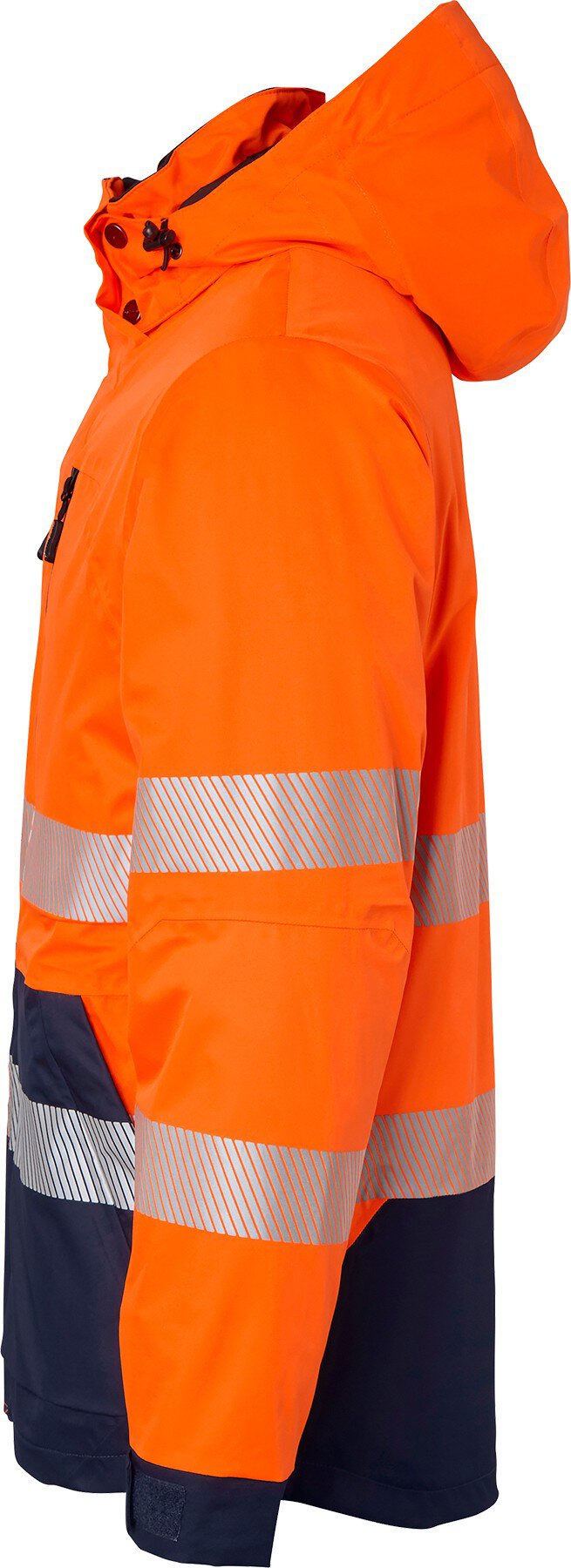 Wind- und wasserdichte Jacke mit versiegelten Nähten und guter Belüftung. Oberbekleidung aus einem Stretch-Stoff für maximalen Komfort. Die Außenjacke hat zwei aufgesetzte Brusttaschen mit Reißverschlüssen. Zwei Fronttaschen. Die rechte Brusttasche hat ein Fach für eine ID-Karte. Große Tasche mit Reißverschluss unter der Klappe. Zwei Innentaschen mit Reißverschlüssen. Abnehmbare Kapuze mit Knöpfen. Verstellbare Ärmelabschlüsse. Verstellbarer Saum. Ärmel mit Daumenloch. Die Außenjacke kann als Shell-Jacke ohne Futter getragen werden. Das Futter kann separat als Jacke getragen werden. Das Futter hat zwei Fronttaschen und zwei Innentaschen. EN 343 3/3, EN ISO 20471 Klasse 3.