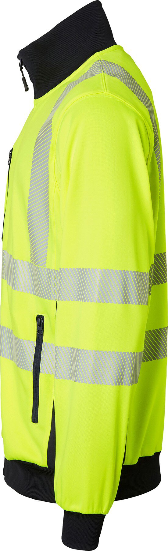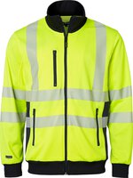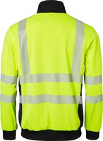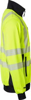 Sweatshirt mit durchgehendem Reißverschlußkragen. Eine Brusttasche mit Reißverschluss und Druckknöpfen sowie ein Ausweisfach. Zwei Vordertaschen mit Reißverschluss. Gerippter Kragen. Elastische Taille und Armabschlüsse. EN ISO 20471 Klasse 3.