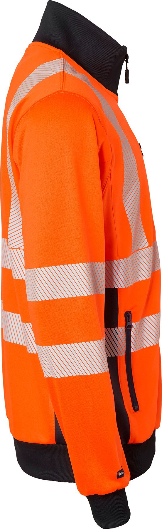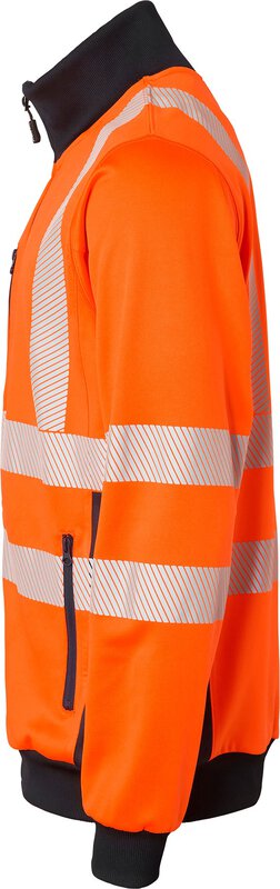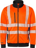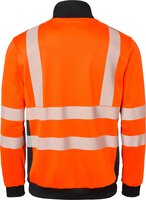 Sweatshirt mit durchgehendem Reißverschlußkragen. Eine Brusttasche mit Reißverschluss und Druckknöpfen sowie ein Ausweisfach. Zwei Vordertaschen mit Reißverschluss. Gerippter Kragen. Elastische Taille und Armabschlüsse. EN ISO 20471 Klasse 3.