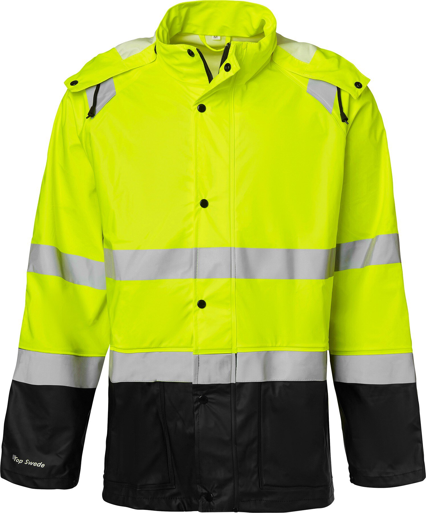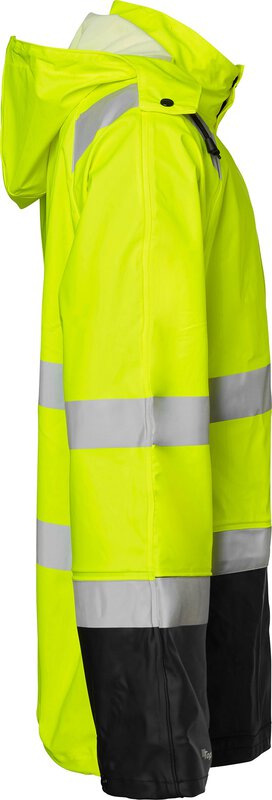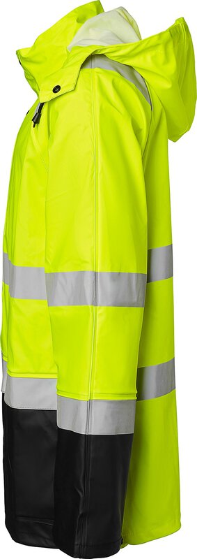 Regenmantel aus High-Vis-Stretchmaterial mit verschweißten Nähten. Reißverschluss mit Abdeckung und Druckknöpfen. Versteckte ID-Kartentasche. Abnehmbare Kapuze mit Kordelzug. Zwei Vordertaschen mit Klappen. Innentasche. Handytasche. Kordelzug am Saum und verstellbare Armabschlüsse. Länge: 80 cm. EN ISO 20471 Klasse 3, EN 343 Klasse 3/1.