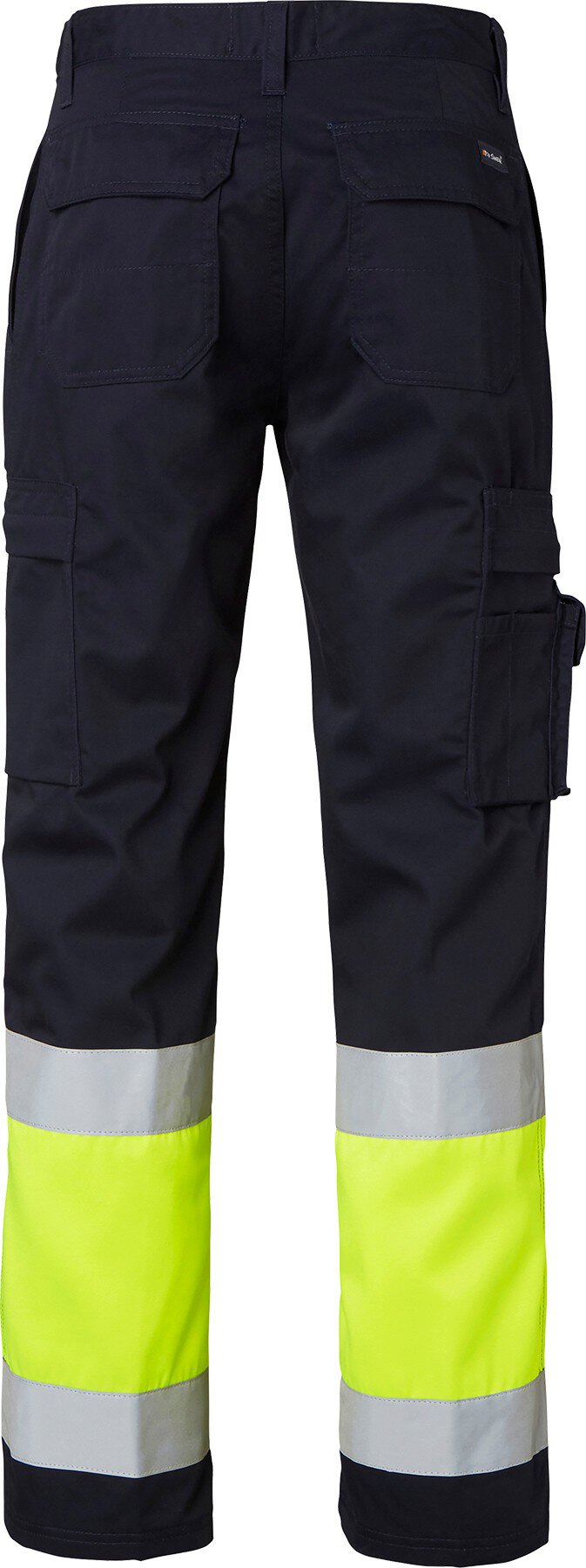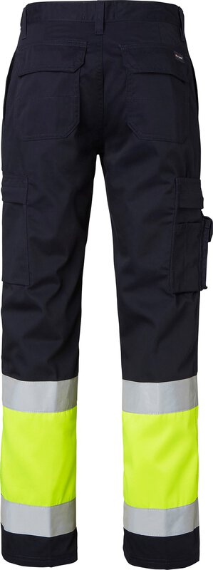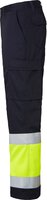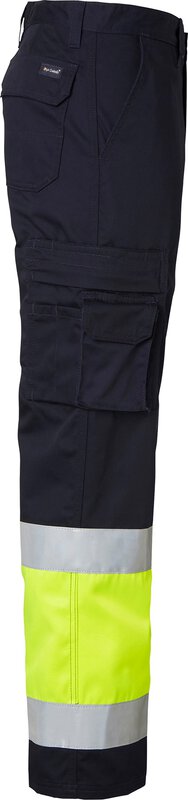 Lange Hose mit zwei abgesteppten Vordertaschen. Zwei verstärkte Gesäßtaschen mit Überschlag und geschlossenen Druckknöpfen. Zwei Beintaschen mit geschlossenen Reißverschlüssen. Die rechte Beintasche hat ein großes Zubehörfach sowie Fächer für Telefon und Stifte. EN ISO 20471 Klasse 1.