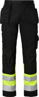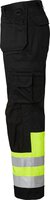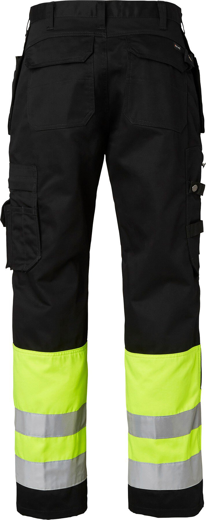 Die Handwerkerhose hat vorgeformte Knie und CORDURA®-Knietaschen. Die Knieschoner können von innen auf zwei Ebenen eingesetzt werden. Zwei mit CORDURA® verstärkte Balgtaschen vorne. Zwei Gesäßtaschen mit Patten und geschlossenen Knöpfen. Lose hängende, mit CORDURA® verstärkte Nageltaschen. Beide haben drei kleinere Zubehörtaschen. Die Hängetasche auf der rechten Seite hat ein verstecktes, faltbares Ausweisfach. Hammerschlaufe. Vorderseitige Zollstocktasche, die für besseren Komfort unten lose ist. Die Zollstocktasche ist mit zwei Messerhaltern, einer Schlaufe und einem Stiftfach ausgestattet. Beintasche mit geschlossenem Reißverschluss und Fächern für Stift und Telefon. D-Ring. EN ISO 20471 Klasse 1.