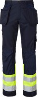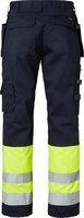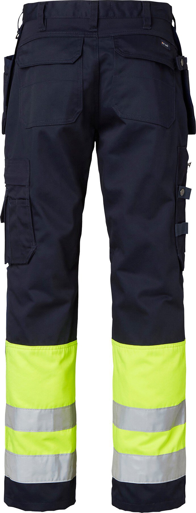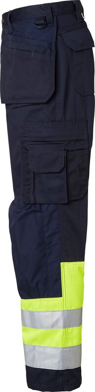 Die Handwerkerhose hat vorgeformte Knie und CORDURA®-Knietaschen. Die Knieschoner können von innen auf zwei Ebenen eingesetzt werden. Zwei mit CORDURA® verstärkte Balgtaschen vorne. Zwei Gesäßtaschen mit Patten und geschlossenen Knöpfen. Lose hängende, mit CORDURA® verstärkte Nageltaschen. Beide haben drei kleinere Zubehörtaschen. Die Hängetasche auf der rechten Seite hat ein verstecktes, faltbares Ausweisfach. Hammerschlaufe. Vorderseitige Zollstocktasche, die für besseren Komfort unten lose ist. Die Zollstocktasche ist mit zwei Messerhaltern, einer Schlaufe und einem Stiftfach ausgestattet. Beintasche mit geschlossenem Reißverschluss und Fächern für Stift und Telefon. D-Ring. EN ISO 20471 Klasse 1.