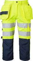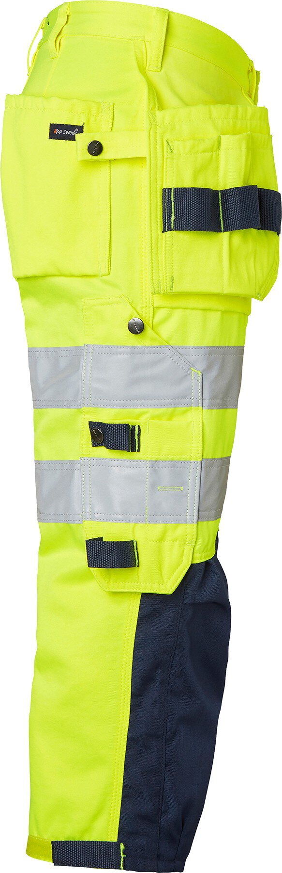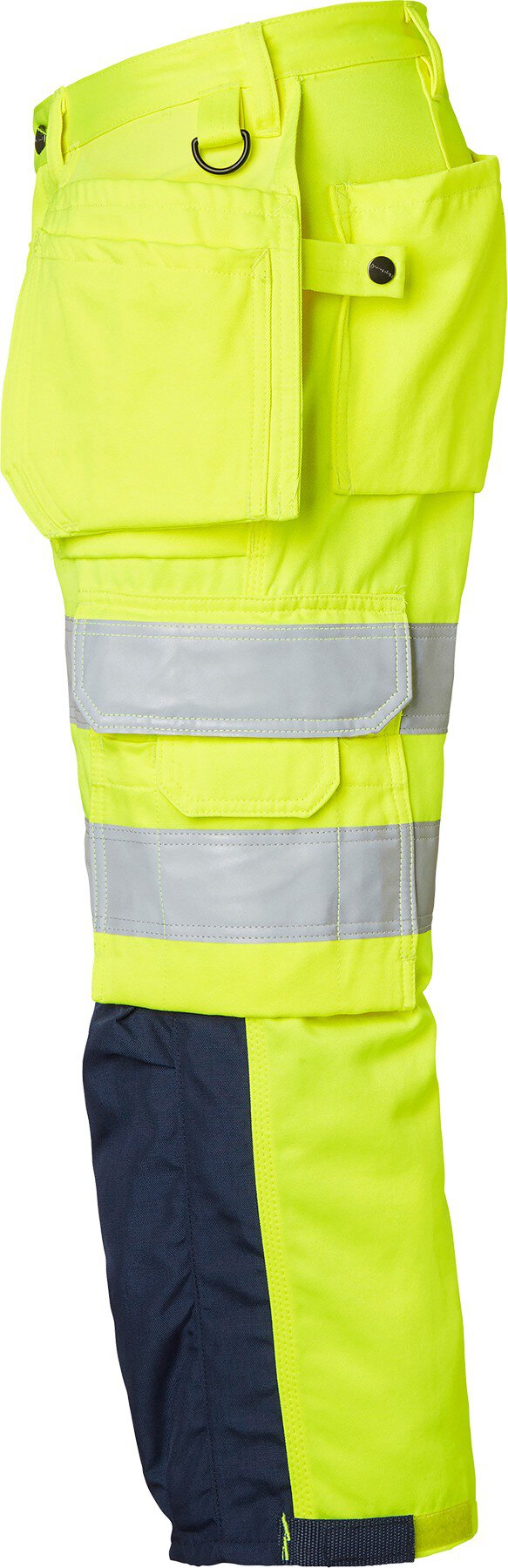 Handwerkerhose mit CORDURA®-Knietaschen. Der Knieschutz kann auf zwei verschiedenen Ebenen angebracht werden. Zwei lose hängende, verstärkte Werkzeugtaschen. Die linke Hängetasche hat ein zusätzliches Fach. Die rechte Hängetasche hat drei kleinere Zubehörfächer, Werkzeugschlaufen und ein verstecktes, aufklappbares Ausweisfach. Zwei feste, verstärkte Faltenbalgtaschen vorne. Zwei verstärkte Gesäßtaschen mit Faltenbalg. Hammerschlaufe. Zollstocktasche vorne für mehr Komfort. Die Zollstocktasche hat einen Messerhalter und einen Messerknopf, eine Schlaufe und ein Stiftfach. Beintasche mit Handyfach und Zubehörfach. D-Ring. EN ISO 20471 Klasse 2.