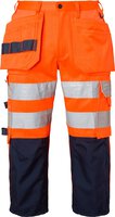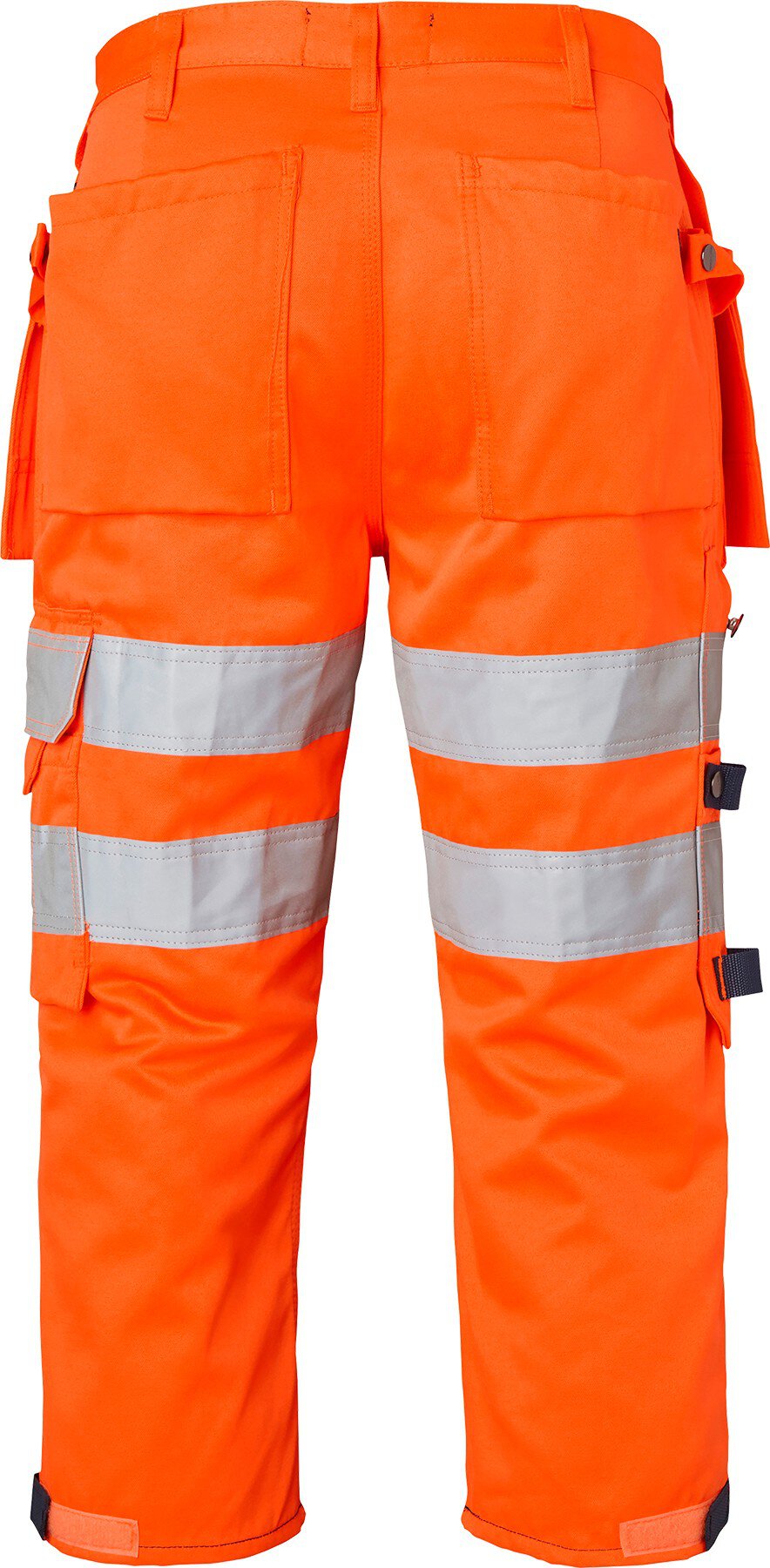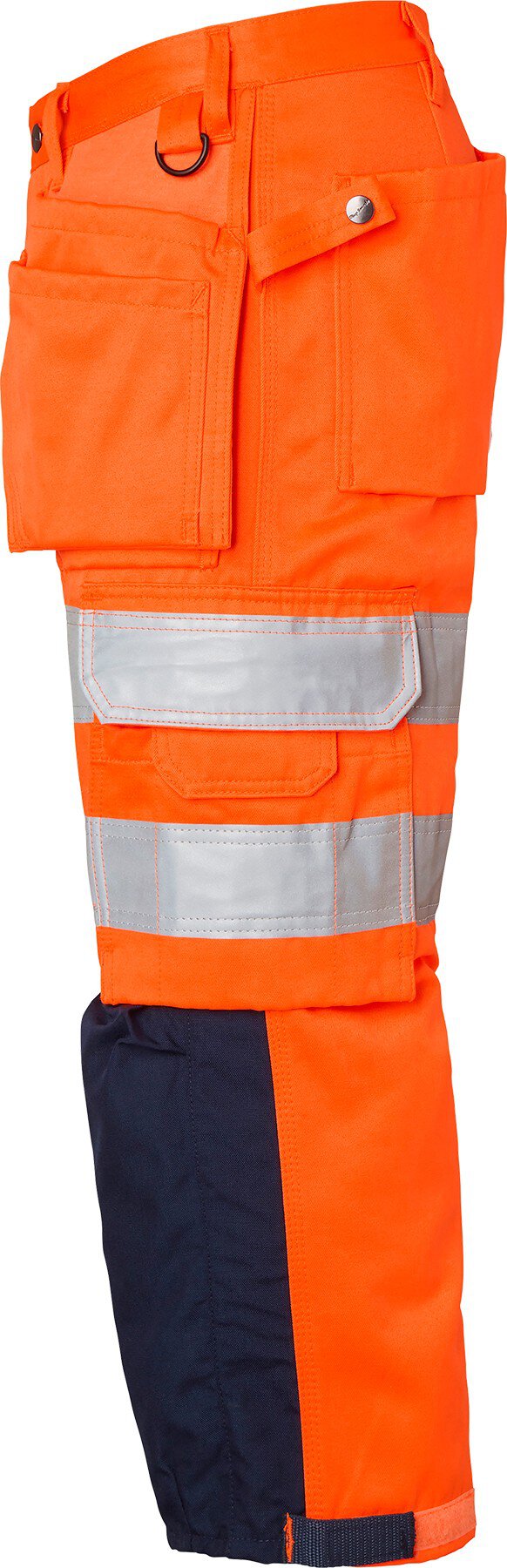 Handwerkerhose mit CORDURA®-Knietaschen. Der Knieschutz kann auf zwei verschiedenen Ebenen angebracht werden. Zwei lose hängende, verstärkte Werkzeugtaschen. Die linke Hängetasche hat ein zusätzliches Fach. Die rechte Hängetasche hat drei kleinere Zubehörfächer, Werkzeugschlaufen und ein verstecktes, aufklappbares Ausweisfach. Zwei feste, verstärkte Faltenbalgtaschen vorne. Zwei verstärkte Gesäßtaschen mit Faltenbalg. Hammerschlaufe. Zollstocktasche vorne für mehr Komfort. Die Zollstocktasche hat einen Messerhalter und einen Messerknopf, eine Schlaufe und ein Stiftfach. Beintasche mit Handyfach und Zubehörfach. D-Ring. EN ISO 20471 Klasse 2.