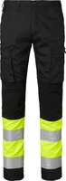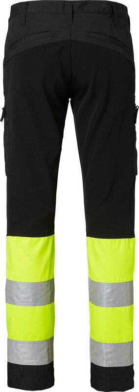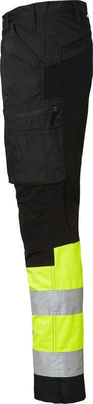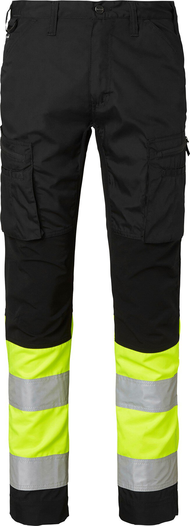 Arbeitshose aus Stretchgewebe in modernem Schnitt mit vorgeformten Knien. Zwei Gesäßtaschen. Zwei Vordertaschen mit einem Zubehörfach. Zwei Beintaschen im Balgstil mit Reißverschluss und Platz für Messer und Stifte. Die rechte Beintasche hat ein geräumiges Zubehörfach und ein Handyfach. D-Ring. Die Beine lassen sich um 5 cm verlängern. Stretcheinsätze in ausgewählten Bereichen für optimale Bewegungsfreiheit. Nylon/Elasthan-Stretcheinsätze im Gesäß, im Schritt und an den Knien. Andere Bereiche sind aus mechanischem Stretchmaterial gefertigt. EN ISO 20471 Klasse 1.