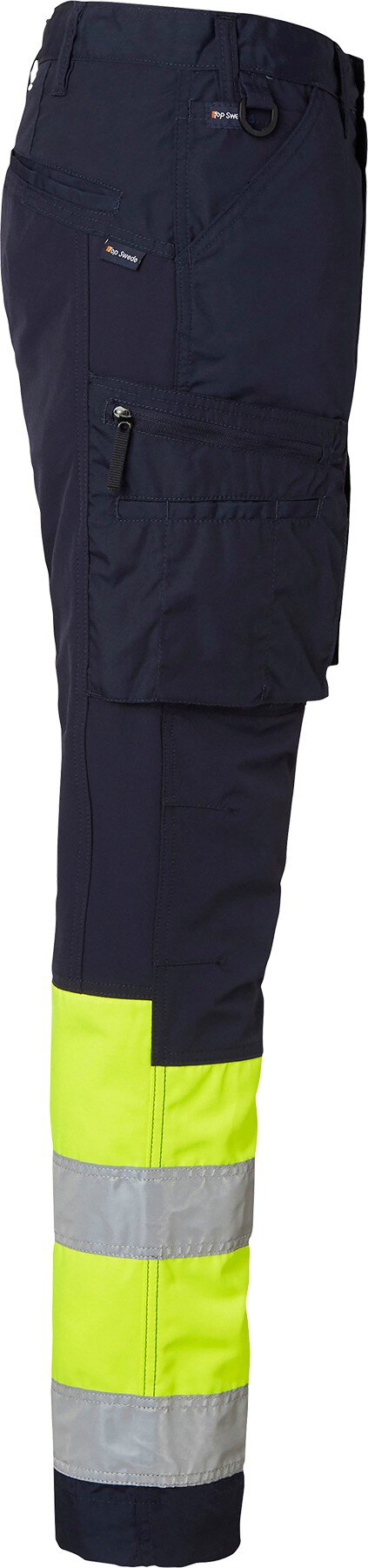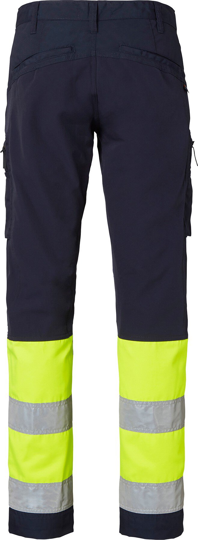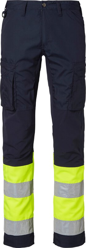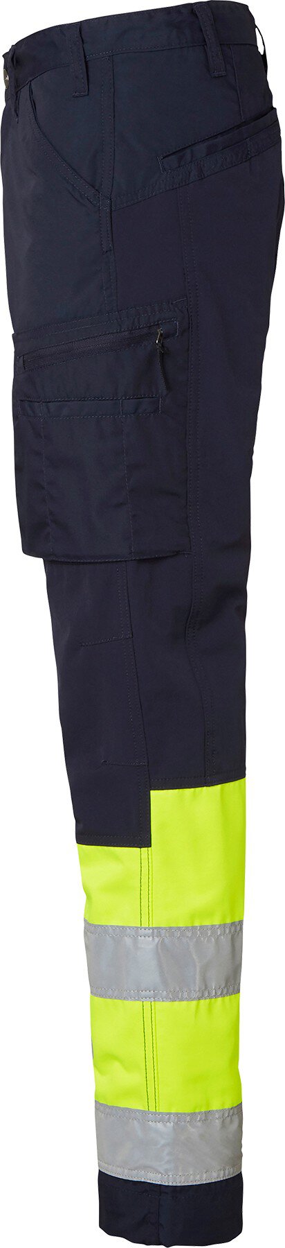 Arbeitshose aus Stretchgewebe in modernem Schnitt mit vorgeformten Knien. Zwei Gesäßtaschen. Zwei Vordertaschen mit einem Zubehörfach. Zwei Beintaschen im Balgstil mit Reißverschluss und Platz für Messer und Stifte. Die rechte Beintasche hat ein geräumiges Zubehörfach und ein Handyfach. D-Ring. Die Beine lassen sich um 5 cm verlängern. Stretcheinsätze in ausgewählten Bereichen für optimale Bewegungsfreiheit. Nylon/Elasthan-Stretcheinsätze im Gesäß, im Schritt und an den Knien. Andere Bereiche sind aus mechanischem Stretchmaterial gefertigt. EN ISO 20471 Klasse 1.