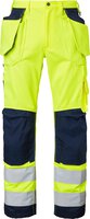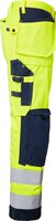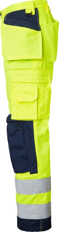 Die Handwerkerhose hat vorgeformte Knie und CORDURA®-Knietaschen. Der Knieschutz kann auf zwei verschiedenen Ebenen positioniert werden. Zwei Vordertaschen und zwei mit CORDURA® verstärkte Gesäßtaschen. Lose hängende, mit CORDURA® verstärkte Nageltaschen. Die Hängetasche auf der linken Seite hat ein zusätzliches Fach. Die rechte Tasche hat drei kleinere Zubehörfächer und ein verstecktes, aufklappbares Ausweisfach. Verstellbarer Hammerhalter. Vorderseitige Zollstocktasche, die unten lose ist, um den Komfort zu erhöhen. Die Zollstocktasche ist mit zwei Messerhaltern, einer Schlaufe und einem Stiftfach ausgestattet. Beintasche mit geschlossenem Reißverschluss und Fächern für Stifte und Telefon. D-Ring. EN ISO 20471 Klasse 2.