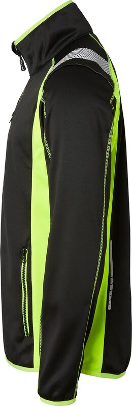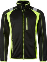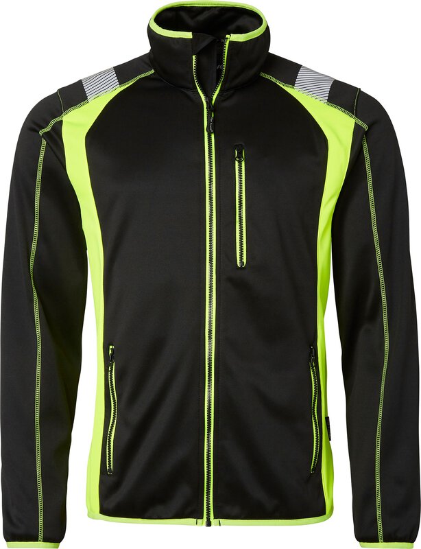 Jacke mit durchgehendem Reißverschluss und Reißverschlussschutz. Eine Brusttasche mit Reißverschluss und Druckknöpfen für ein Ausweisfach. Reflektoren für bessere Sichtbarkeit. Zwei Vordertaschen mit Reißverschluss. Handytasche. Elastische Bündchen und Saum.