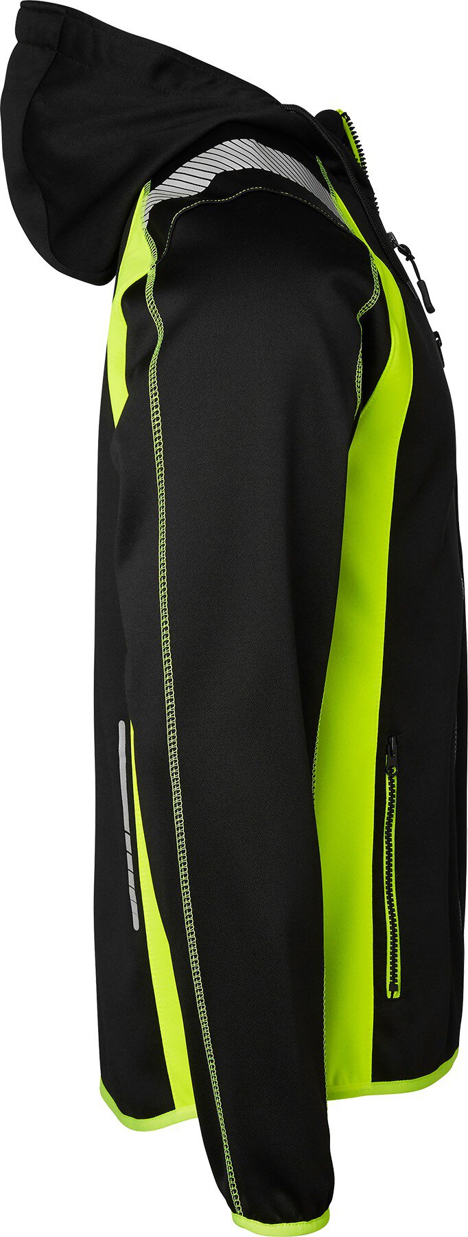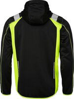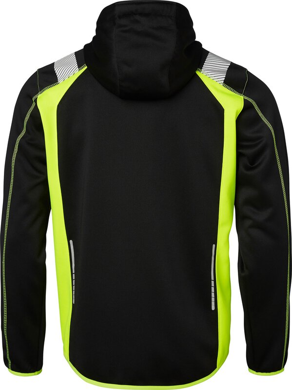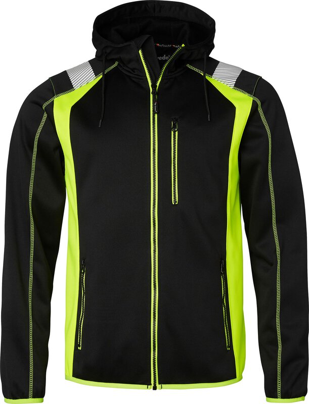 Kapuzenjacke mit durchgehendem Reißverschluss und Reißverschlussabdeckung. Eine Brusttasche mit Reißverschluss und Druckknöpfen für ein Ausweisfach. Reflektoren für bessere Sichtbarkeit. Zwei Fronttaschen mit Reißverschluss. Kapuze mit Kordelzug. Handytasche. Elastische Bündchen und Saum.