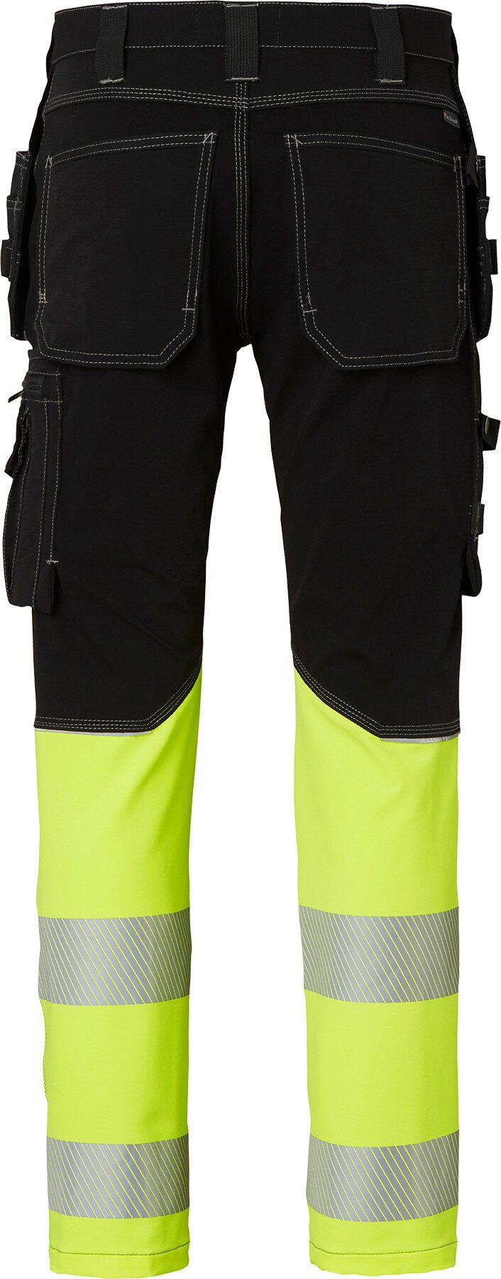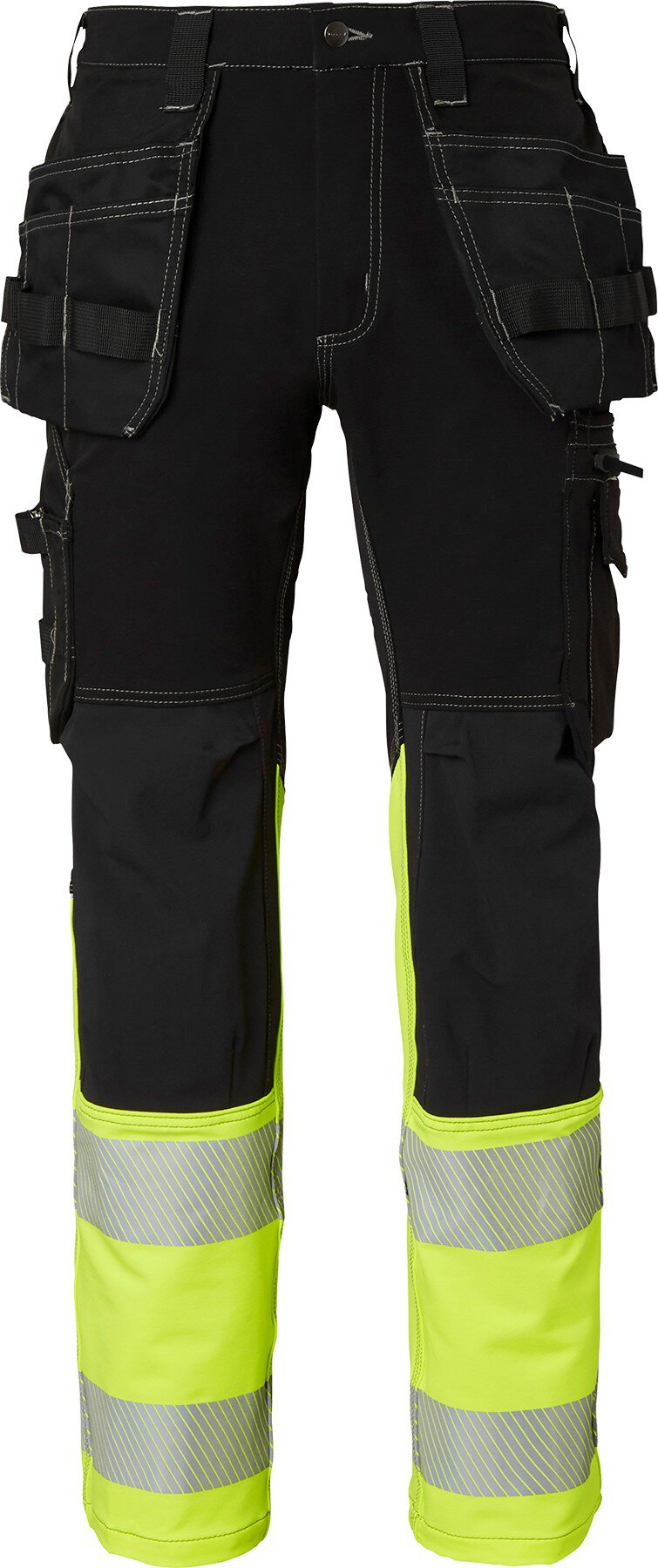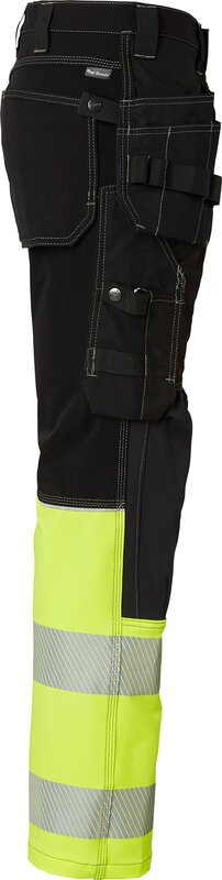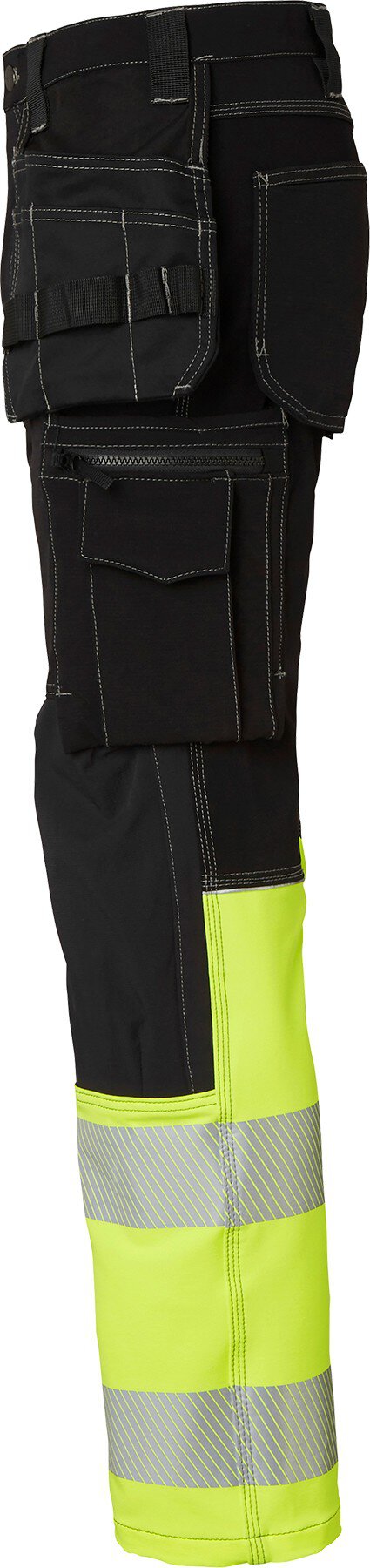 Handwerkerhose aus Vier-Wege-Stretchmaterial in modernem Schnitt. Die Hose hat vorgeformte Knie und CORDURA®-Knietaschen. Der Knieschutz kann auf zwei verschiedenen Ebenen positioniert werden. Zwei Vordertaschen. Zwei verstärkte Gesäßtaschen. Lose hängende, mit CORDURA® verstärkte Nageltaschen. Die Hängetaschen sind mit drei Zubehörfächern und Werkzeugschlaufen ausgestattet. Ausweistasche. Verstellbarer Hammerhalter. Vorderseitige Zollstocktasche, die unten lose ist, um den Komfort zu erhöhen. Die Zollstocktasche hat zwei Messerhalter, eine Messerschlaufe und eine Stifttasche. Beintasche mit Reißverschluss, großem Extrafach und Handytasche. Reflektierender Besatz auf der Rückseite für bessere Sichtbarkeit. EN ISO 20471 Klasse 1