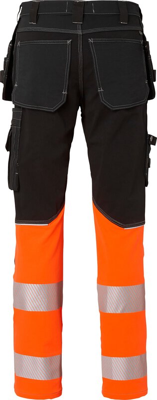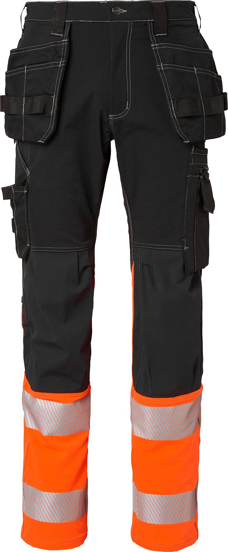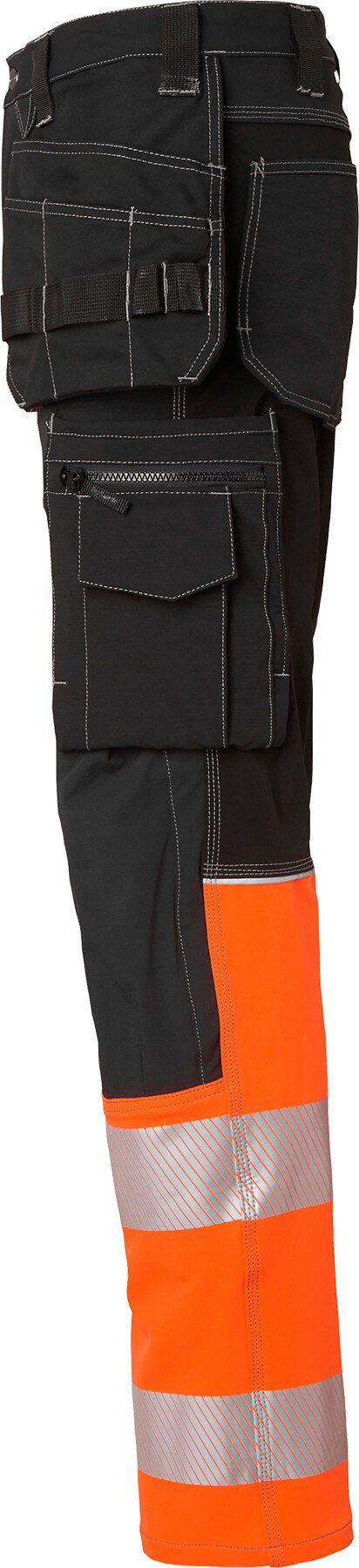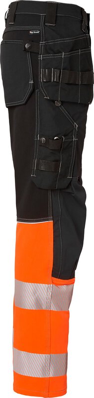 Handwerkerhose aus Vier-Wege-Stretchmaterial in modernem Schnitt. Die Hose hat vorgeformte Knie und CORDURA®-Knietaschen. Der Knieschutz kann auf zwei verschiedenen Ebenen positioniert werden. Zwei Vordertaschen. Zwei verstärkte Gesäßtaschen. Lose hängende, mit CORDURA® verstärkte Nageltaschen. Die Hängetaschen sind mit drei Zubehörfächern und Werkzeugschlaufen ausgestattet. Ausweistasche. Verstellbarer Hammerhalter. Vorderseitige Zollstocktasche, die unten lose ist, um den Komfort zu erhöhen. Die Zollstocktasche hat zwei Messerhalter, eine Messerschlaufe und eine Stifttasche. Beintasche mit Reißverschluss, großem Extrafach und Handytasche. Reflektierender Besatz auf der Rückseite für bessere Sichtbarkeit. EN ISO 20471 Klasse 1