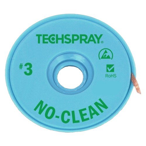 Techspray 1822-5F No-Clean Entlötlitze mit einer Breite von 1,9 mm hinterlässt keine ionischen Flussmittelrückstände, die sich ansammeln und Verzweigungen, so genannte „Dendriten“, bilden können. Das Entlötgeflecht ist ein mit Flussmittel benetztes Kupfergeflecht, das zum Entfernen von Lötmittel verwendet wird, sodass Bauteile ausgetauscht und überschüssiges Lot entfernt werden können. Der Lötkolben wird auf die Litze aufgesetzt - sobald beides auf die richtige Temperatur gebracht worden ist, wird das Flussmittel aktiviert. Durch die Kapillarwirkung des Geflechts wird das Lot an der Litze hochgezogen. Techspray Entlötlitzen sind auf ESD sicheren Spulen erhältlich und somit für die Verwendung mit ESD-empfindlichen Bauteilen geeignet.