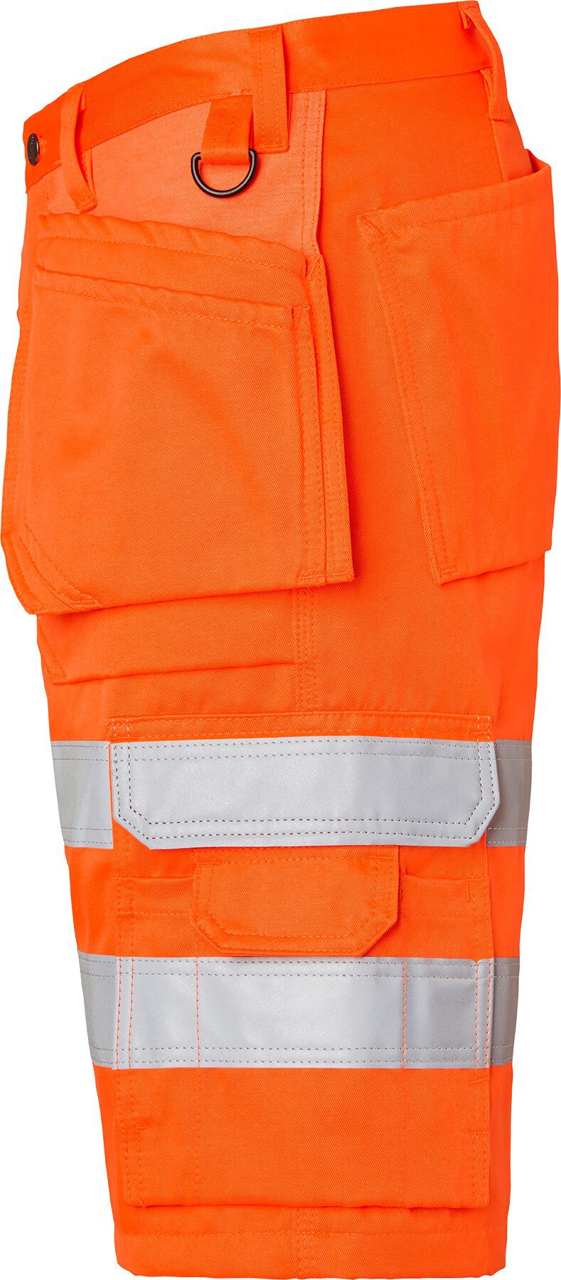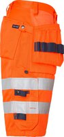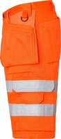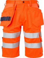 High-Vis-Handwerker-Shorts. Zwei verstärkte Vordertaschen. Zwei verstärkte Gesäßtaschen. Zwei lose hängende, verstärkte Nageltaschen. Die Hängetasche auf der linken Seite hat ein zusätzliches Fach. Die Hängetasche auf der rechten Seite hat drei kleinere Zubehörfächer, Werkzeugschlaufen und ein verstecktes, aufklappbares Ausweisfach. Verstellbarer Hammerhalter. D-Ring und eine vordere Zollstocktasche, die unten lose ist, um den Tragekomfort zu erhöhen. Die Zollstocktasche hat zwei Messerhalter, eine Schlaufe und ein Stiftfach. Beintasche mit Klappe und Fächern für Stift und Telefon. EN ISO 20471 Klasse 2.