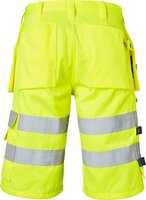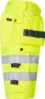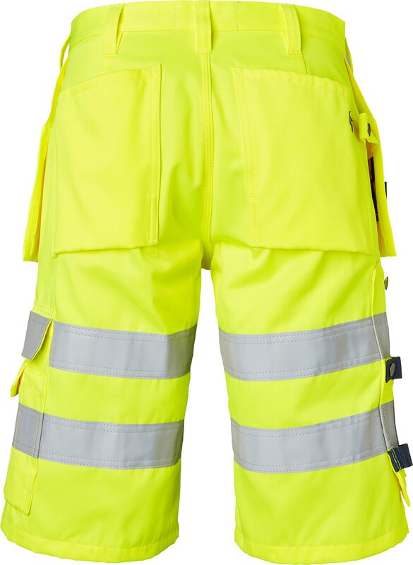 High-Vis-Handwerker-Shorts. Zwei verstärkte Vordertaschen. Zwei verstärkte Gesäßtaschen. Zwei lose hängende, verstärkte Nageltaschen. Die Hängetasche auf der linken Seite hat ein zusätzliches Fach. Die Hängetasche auf der rechten Seite hat drei kleinere Zubehörfächer, Werkzeugschlaufen und ein verstecktes, aufklappbares Ausweisfach. Verstellbarer Hammerhalter. D-Ring und eine vordere Zollstocktasche, die unten lose ist, um den Tragekomfort zu erhöhen. Die Zollstocktasche hat zwei Messerhalter, eine Schlaufe und ein Stiftfach. Beintasche mit Klappe und Fächern für Stift und Telefon. EN ISO 20471 Klasse 2.