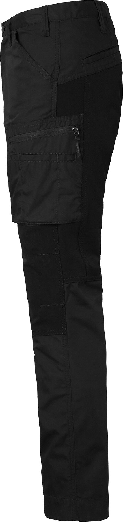 Arbeitshose aus Stretchgewebe in modernem Schnitt mit vorgeformten Knien. Zwei Gesäßtaschen. Zwei Vordertaschen mit einem Zubehörfach. Zwei Beintaschen im Balgstil mit Reißverschluss und Platz für Messer und Stifte. Die rechte Beintasche hat ein geräumiges Zubehörfach und ein Handyfach. D-Ring. Die Beine lassen sich um 5 cm verlängern. Stretcheinsätze in ausgewählten Bereichen für optimale Bewegungsfreiheit. Nylon/Elasthan-Stretcheinsätze im Gesäß, im Schritt und an den Knien. Andere Bereiche sind aus mechanischem Stretchmaterial gefertigt.