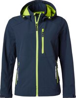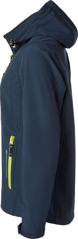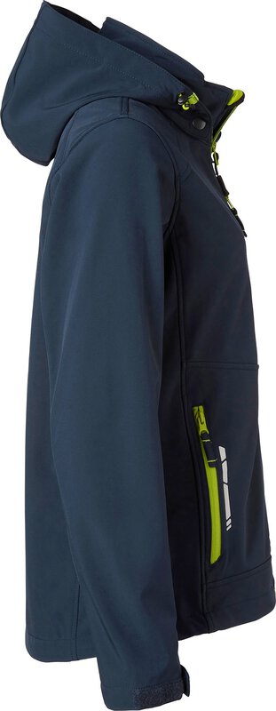 Dreilagige Softshell-Jacke für Damen. Durchgehender Reißverschluss mit Windschutz und Reißverschlussabdeckung bis zum Kragen. Abnehmbare und verstellbare Kapuze. Reflektierende Besätze. Eine Brusttasche mit Reißverschluss. Zwei Fronttaschen mit Reißverschluss. Verstellbare Bündchen. Kordelzug am Saum.