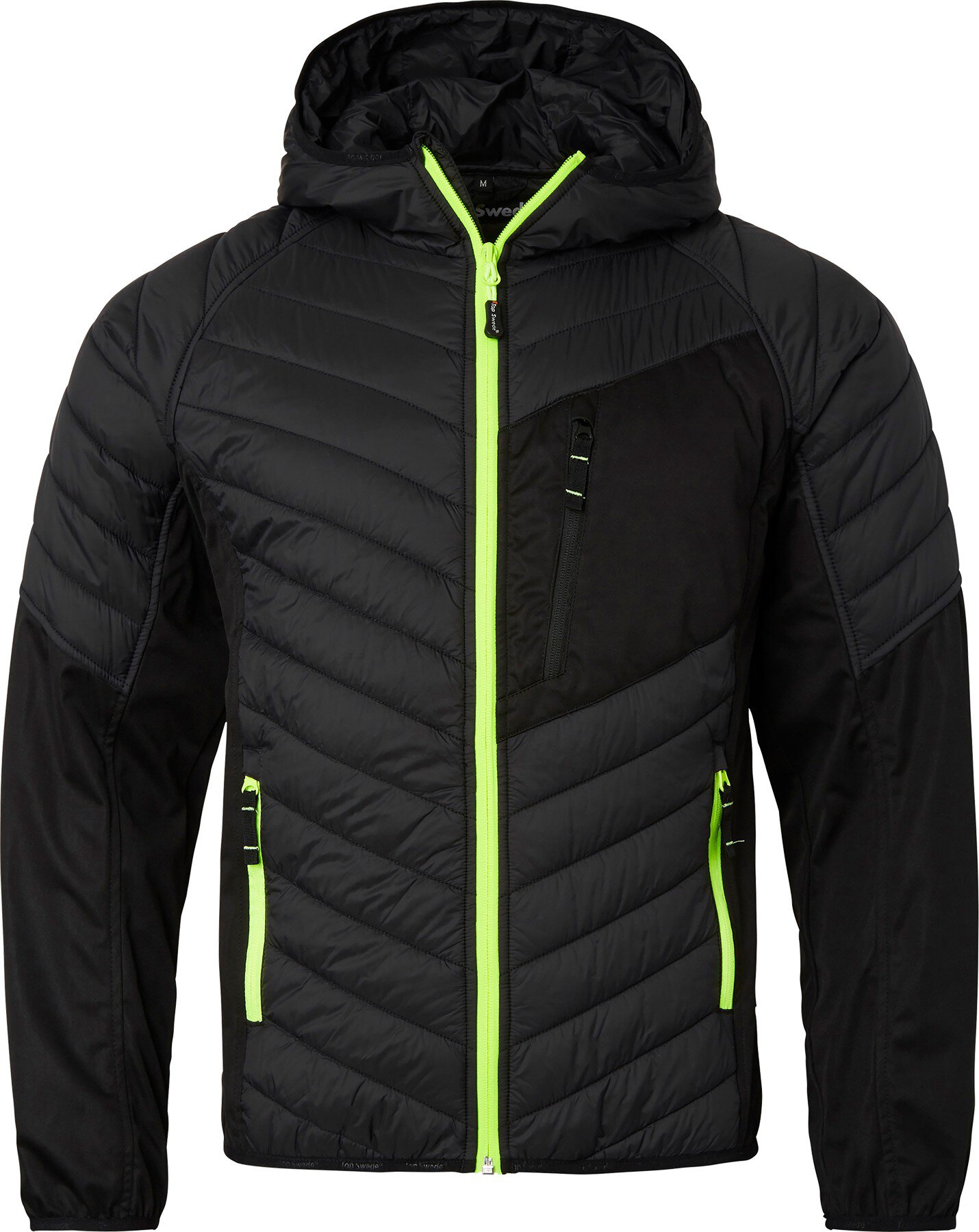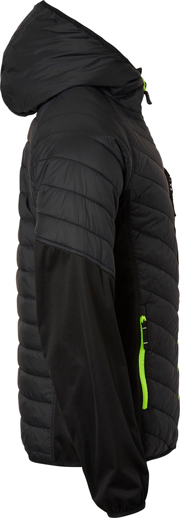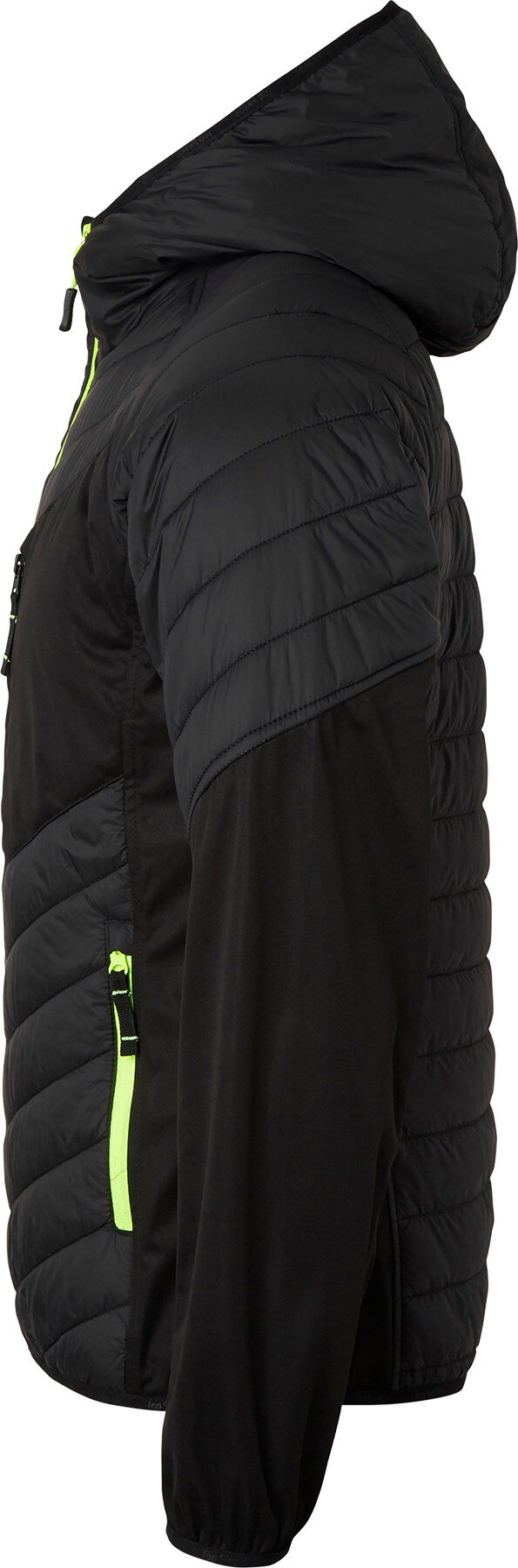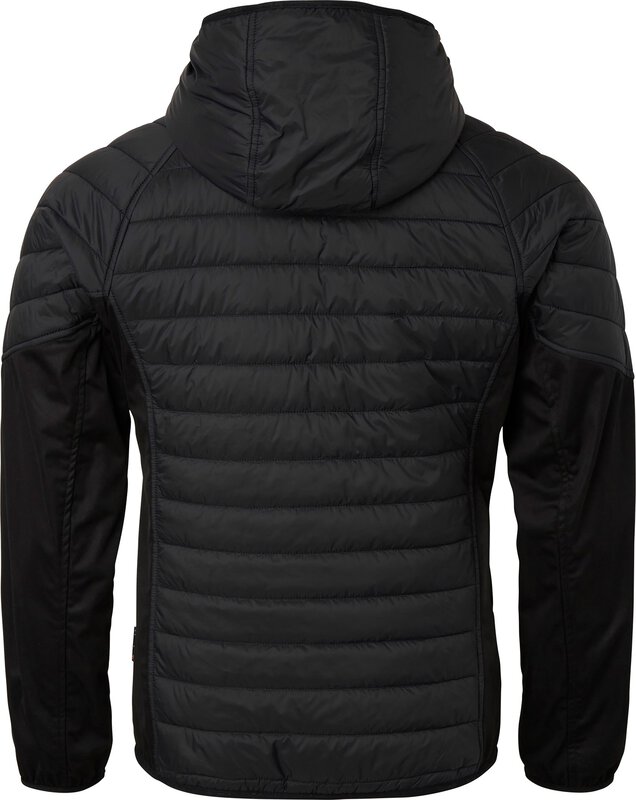 Moderne, leichte Steppjacke mit Kapuze. Daunenähnliches Material mit Softshell-Stretcheinsätzen an den Seiten und Unterarmen. Zwei Fronttaschen und eine Brusttasche mit Reißverschlüssen. Elastische Bündchen und Saum.