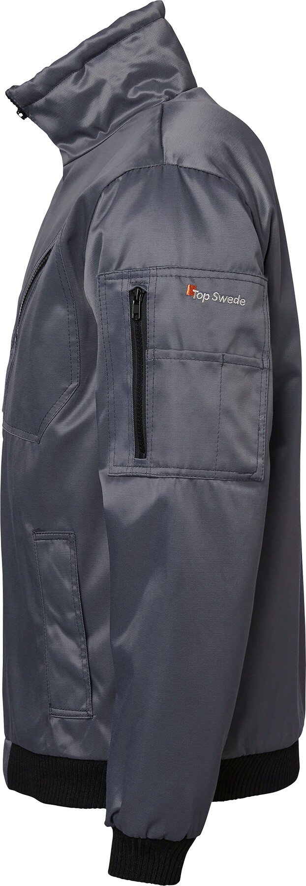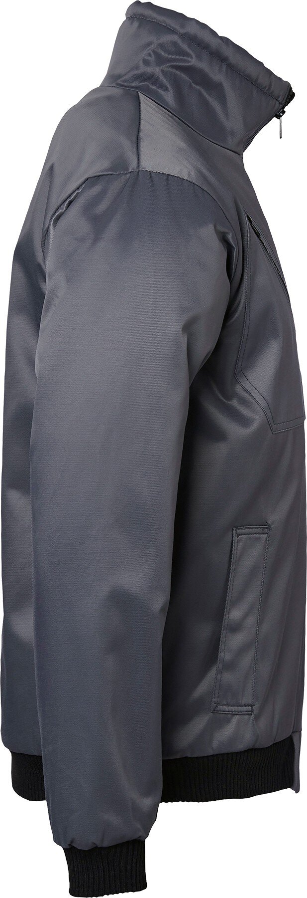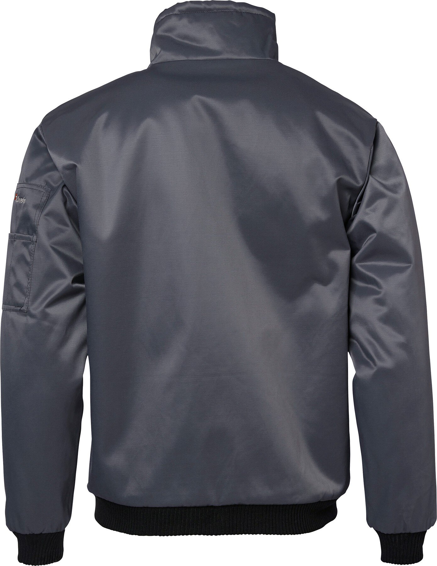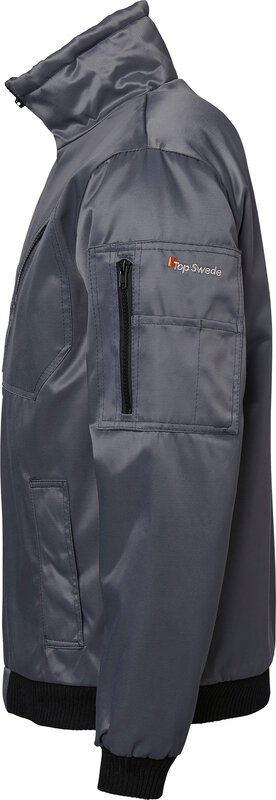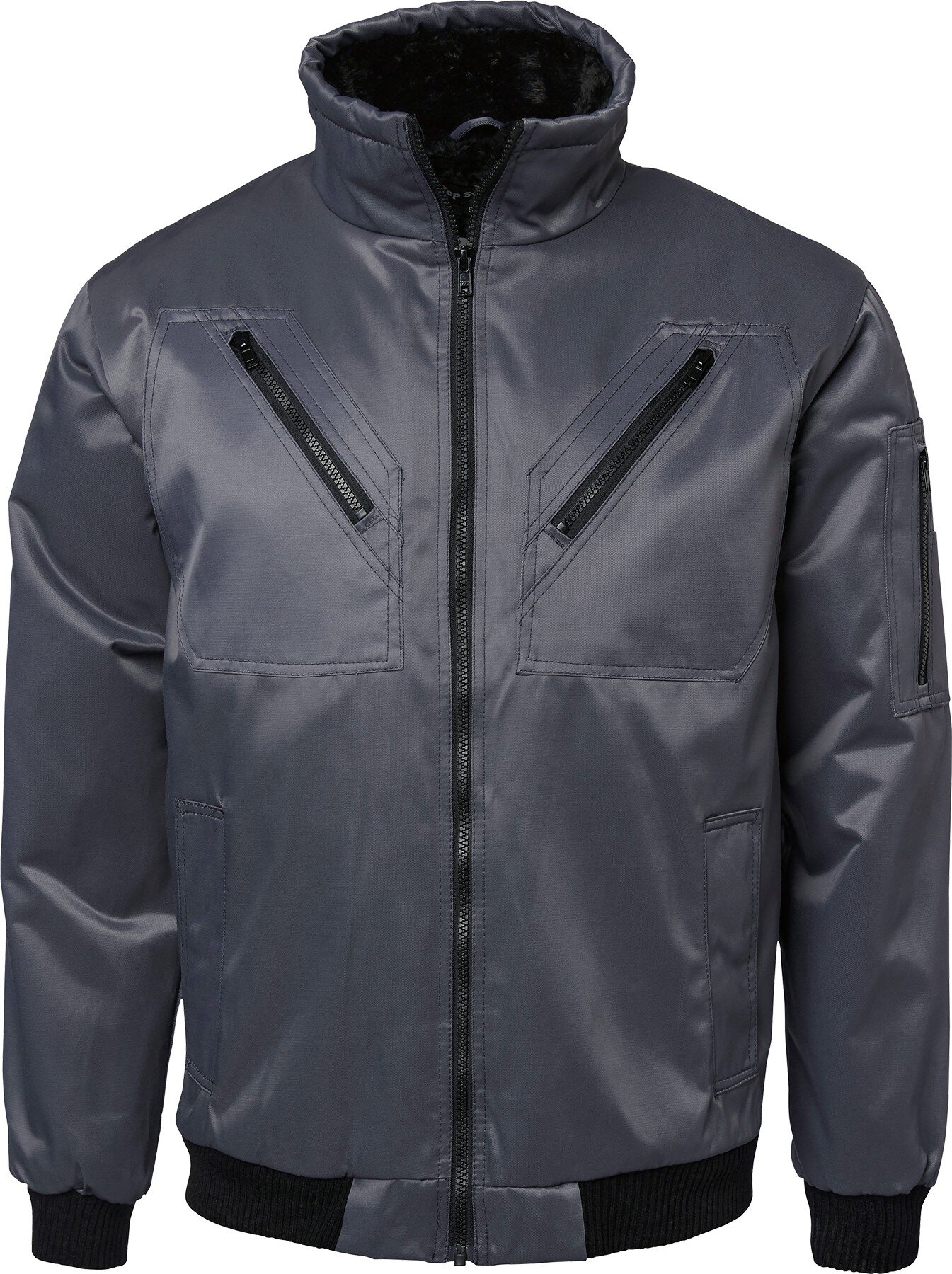 Gefütterte Fliegerjacke. Zwei Brusttaschen mit Reißverschlüssen, zwei Vordertaschen und zwei Innentaschen. Ärmeltasche mit Reißverschluss und Stiftfach. Arm- und TaillenBündchen.