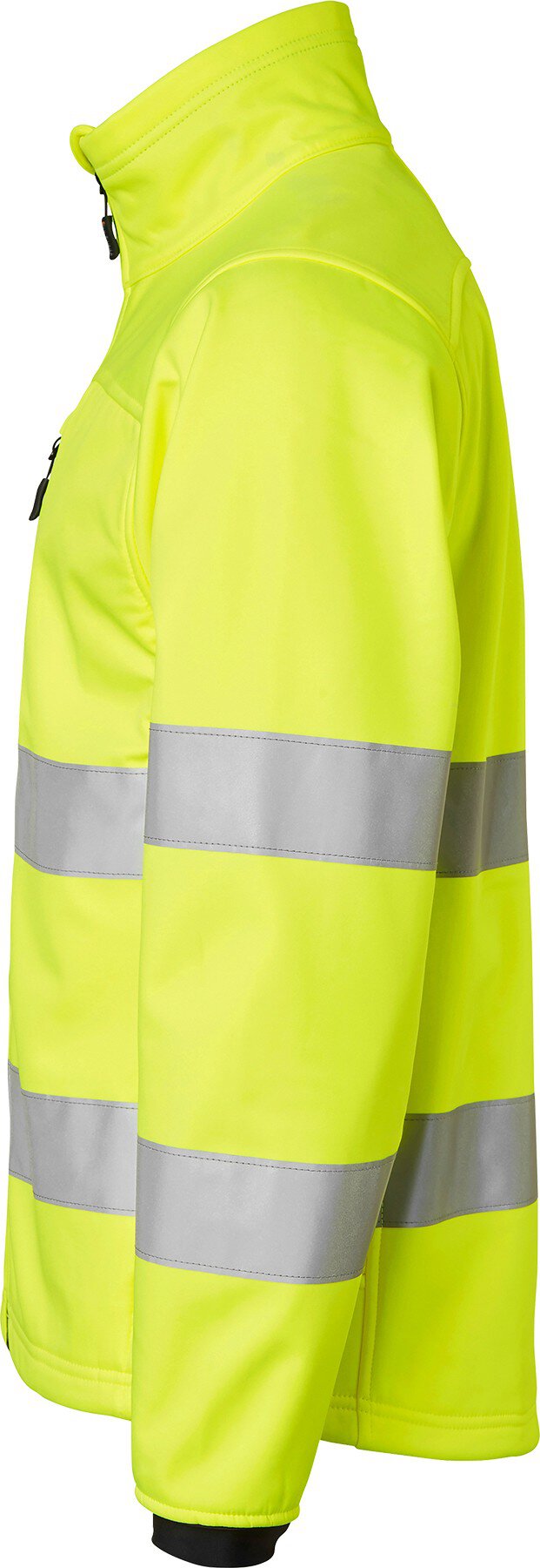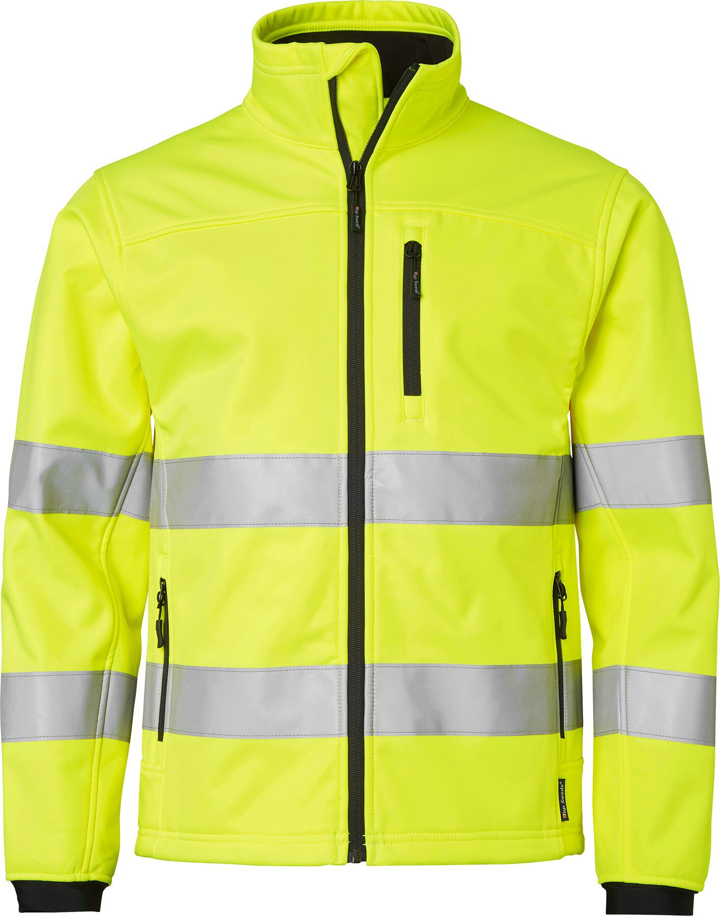 Softshell-Jacke mit durchgehendem Reißverschluss und Reißverschluss-Schutz. Eine Brusttasche und zwei Fronttaschen mit Reißverschlüssen. Das Softshell-Material besteht aus drei laminierten Schichten. Flexible Oberbekleidung mit einer winddichten und stark wasserabweisenden Membran. Innenmaterial aus warmem Fleece. EN ISO 20471 Klasse 3.