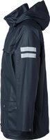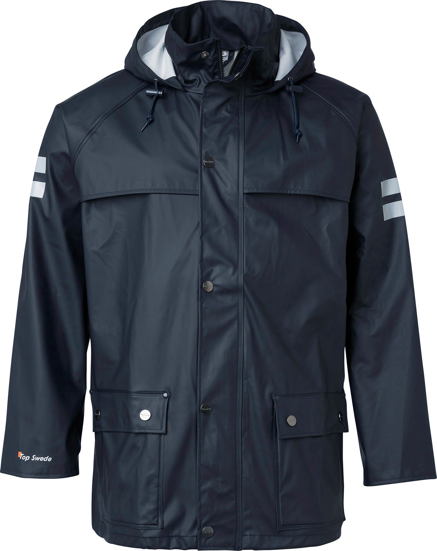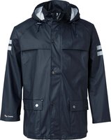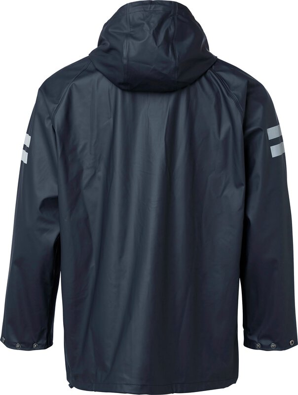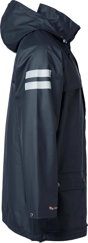 80 cm langer Regenmantel aus einem flexiblen Stretchmaterial. Zwei Fronttaschen mit Klappen. Reißverschluss mit Leiste und Druckknöpfen. Kapuze mit Kordelzug. Geschweißte Nähte. Verstellbare Bündchen. EN 343 3/1.