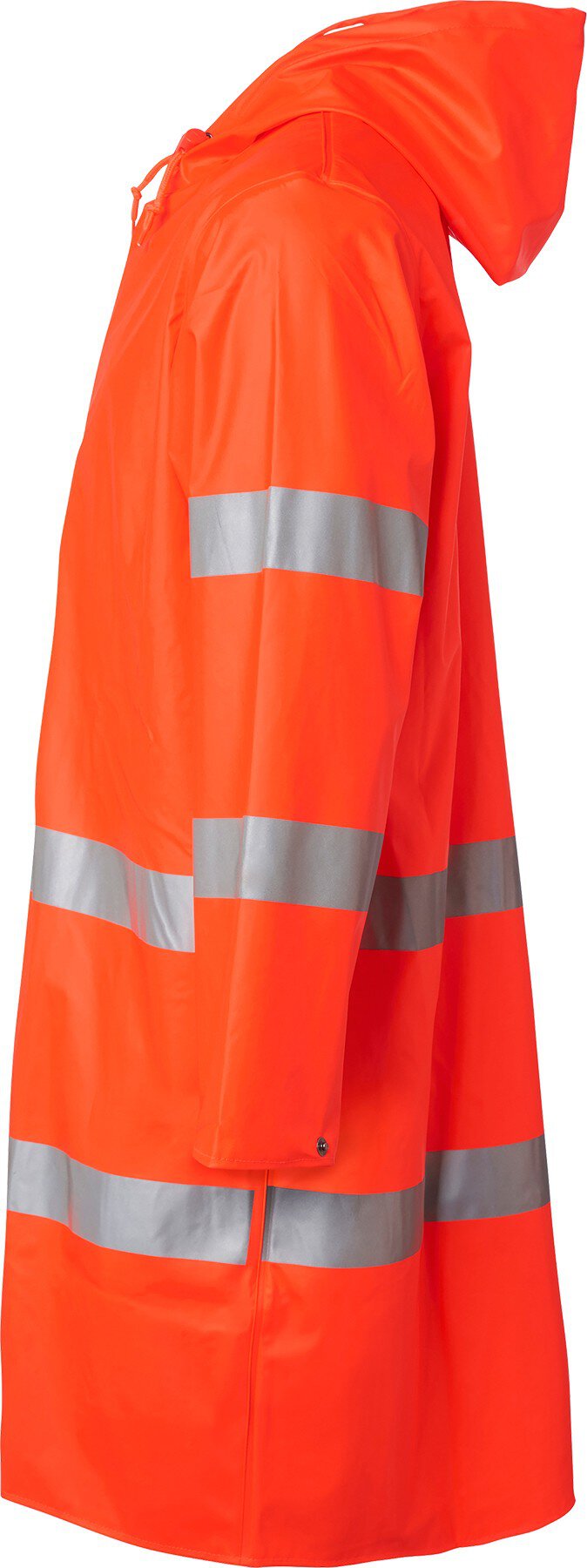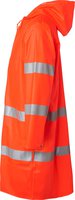 Warnschutz-Regenmantel mit einer Länge von 100 cm aus flexiblem, dehnbarem Material. Reißverschluss mit Blende und Druckknöpfen. Kapuze mit Kordelzug. Geschweißte Nähte. Verstellbare Bündchen. EN ISO 20471 Klasse 3, EN 343 3/1.