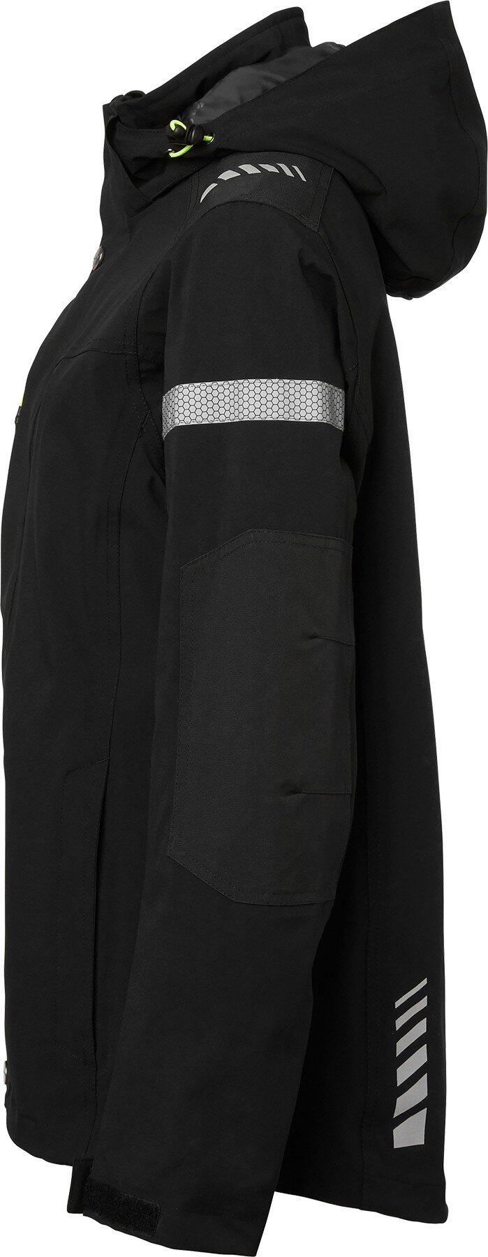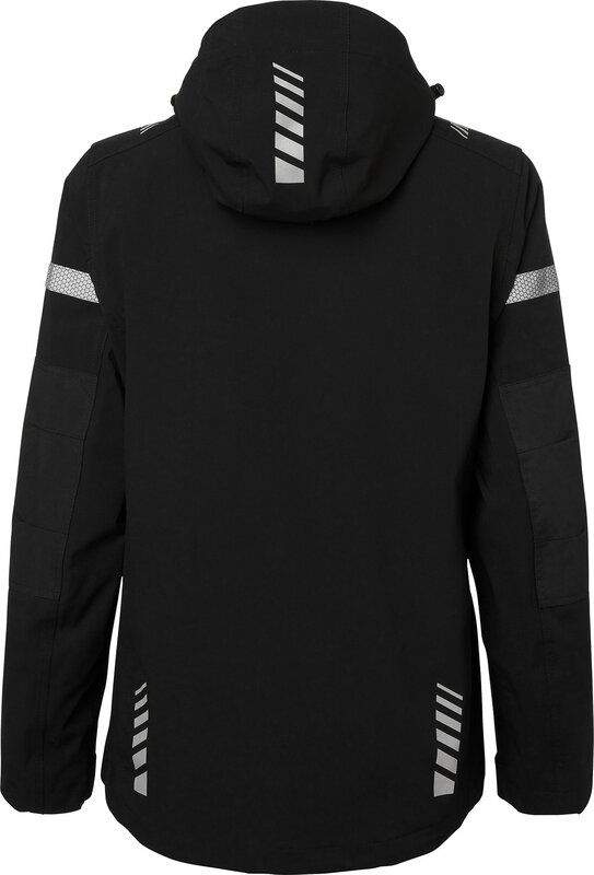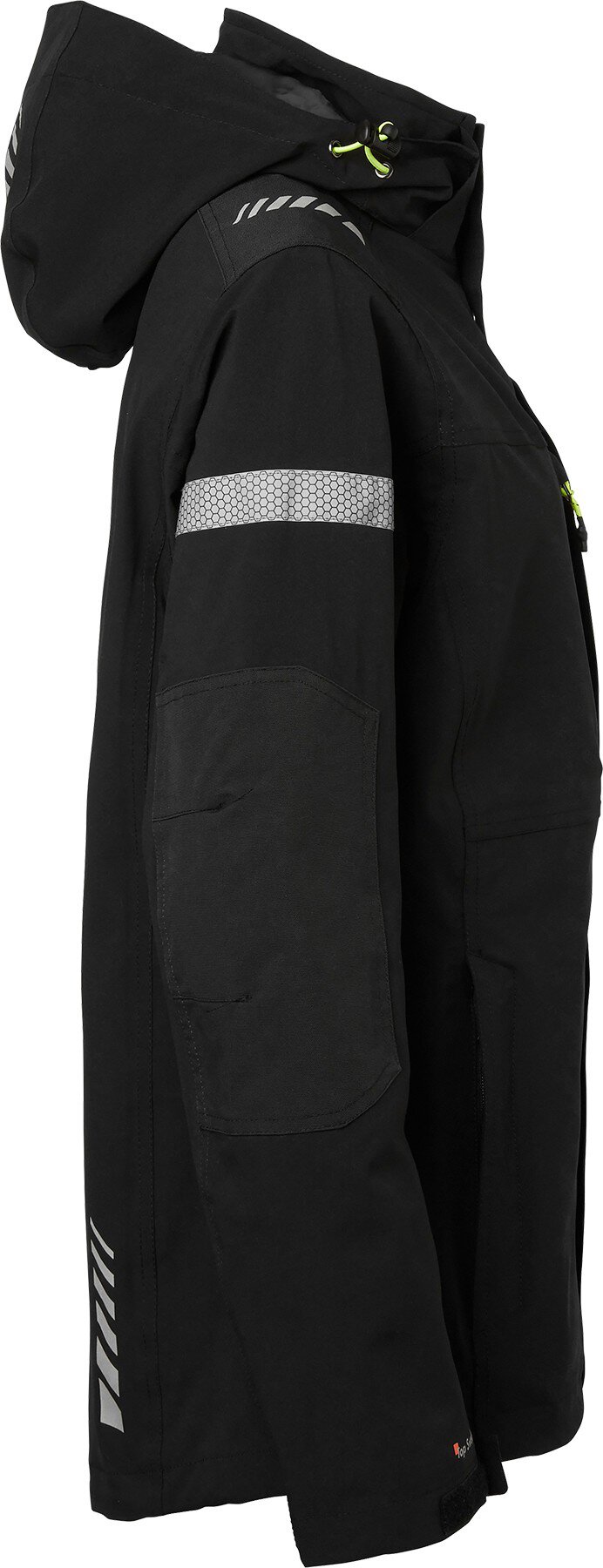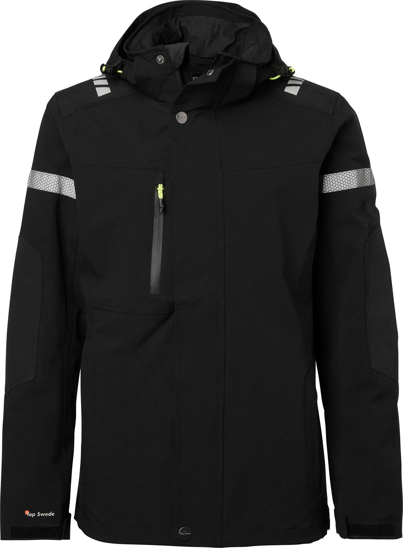 Wind- und wasserdichte Jacke mit verschweißten Nähten und guter Atmungsaktivität. Rückenteil aus einem Material, das die Belüftung erhöht. Eine Brusttasche mit wasserdichtem Reißverschluss. Eine Innentasche/Telefontasche. Geräumige Napoleon-Zubehörtasche unter der Lasche. Abnehmbare Kapuze. Reflektierende Besätze für bessere Sichtbarkeit. Verstellbare Manschetten. Verstellbarer Saum. Manschette mit Daumenloch. Wasserdichtigkeit 10.000 mm, Atmungsaktivität 8.000 g/m². EN343 Klasse 3.