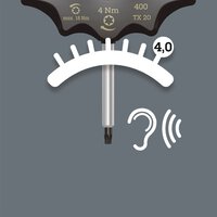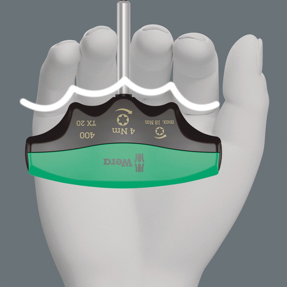 Wera Drehmomentindikator mit festem Drehmoment für TORX® Schrauben. Manipulationsgeschützt. Die robuste Rutschkupplung garantiert ein deutlich hör- und fühlbares Auslösesignal bei Erreichen des eingestellten Drehmomentes und ein Überziehen des Drehmomentes ist unmöglich. Mehrfach höheres Lösemoment als das eingestellte Anzugsmoment, dadurch wird größtenteils kein weiteres Werkzeug zum Lösen von Schraubverbindungen benötigt. Die Form des Griffs füllt die ganze Hand gut aus und die Finger liegen in den weich gerundeten Griffmulden. Dadurch ist eine optimale, ergonomische Kraftübertragung gewährleistet.
